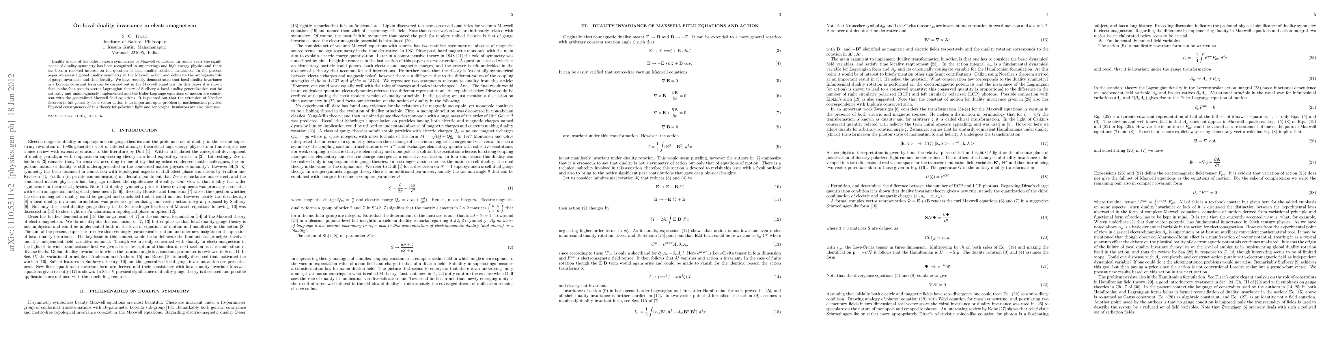 Duality is one of the oldest known symmetries of Maxwell equations. In recent years the significance of duality symmetry has been recognized in superstrings and high energy physics and there has been a renewed interest on the question of local duality rotation invariance. In the present paper we re-visit global duality symmetry in the Maxwell action and delineate the ambiguous role of gauge invariance and time locality. We have recently demonstrated that local duality invariance in a Lorentz covariant form can be carried out in the Maxwell equations. In this paper it is shown that in the four-pseudo vector Lagrangian theory of Sudbery a local duality generalization can be naturally and unambiguously implemented and the Euler-Lagrange equations of motion are consistent with the generalized Maxwell field equations. It is pointed out that the extension of Noether theorem in full generality for a vector action is an important open problem in mathematical physics. Physical consequences of this theory for polarized light and topological insulators are also discussed.