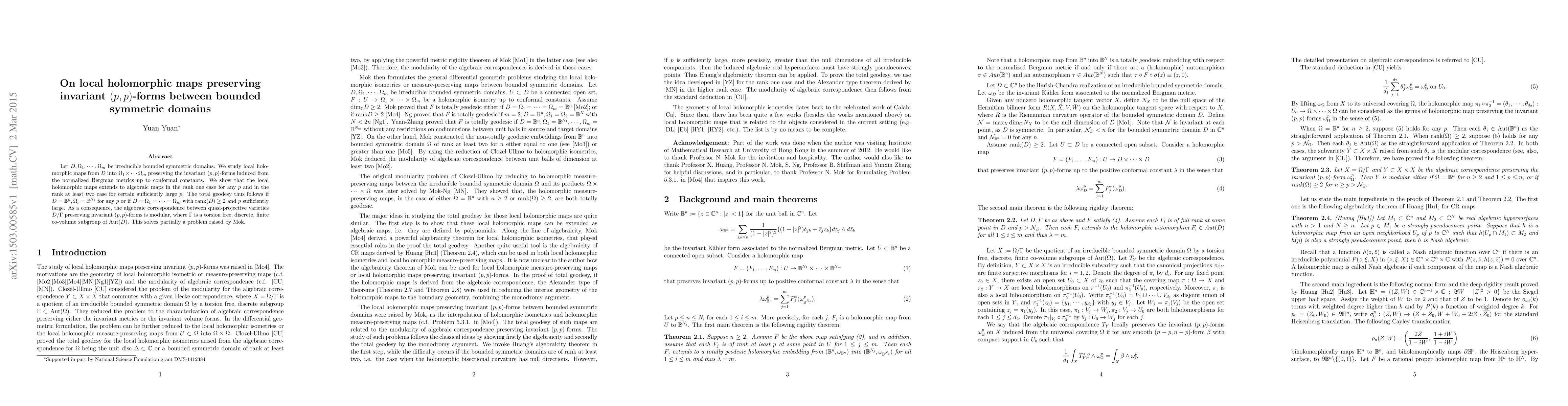 This paper investigates local holomorphic maps between bounded symmetric domains that preserve invariant $(p,p)$-forms, proving that such maps extend to algebraic maps under certain conditions. The results establish total geodesy for specific cases and demonstrate a modular correspondence for quasi-projective varieties.