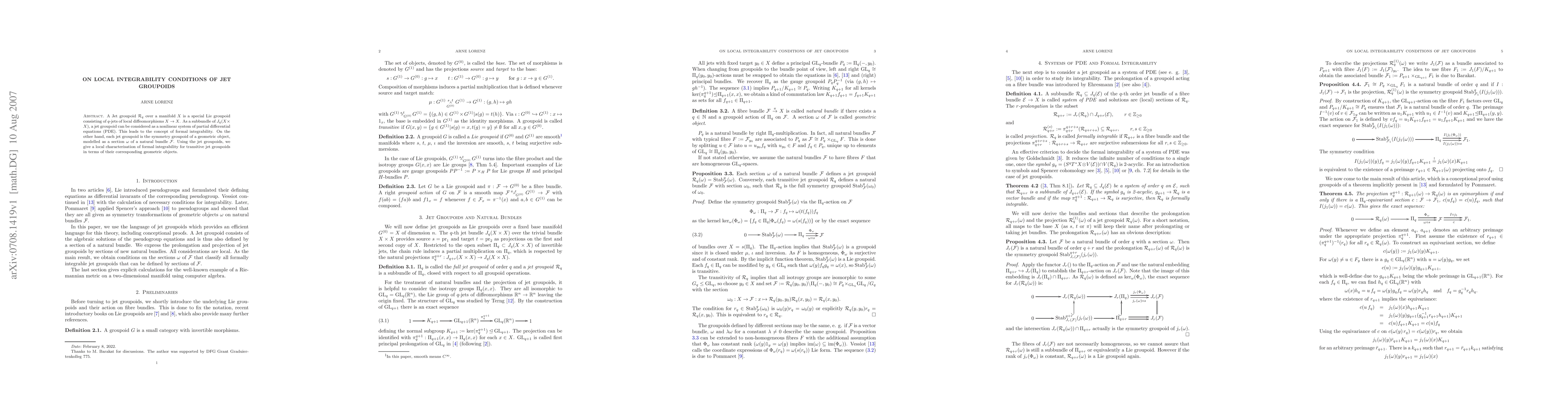 This paper explores jet groupoids, which are Lie groupoids formed from q-jets of local diffeomorphisms, and establishes local integrability conditions for transitive jet groupoids. It characterizes formal integrability in terms of the geometric objects modeled as sections of natural bundles.