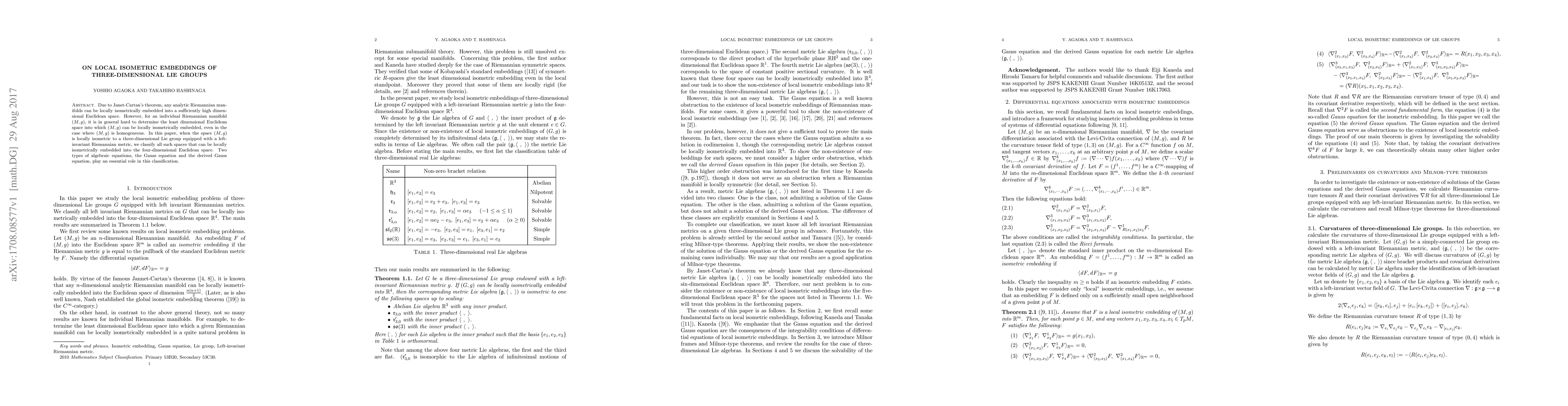 Due to Janet-Cartan's theorem, any analytic Riemannian manifolds can be locally isometrically embedded into a sufficiently high dimensional Euclidean space. However, for an individual Riemannian manifold (M,g), it is in general hard to determine the least dimensional Euclidean space into which (M,g) can be locally isometrically embedded, even in the case where (M,g) is homogeneous. In this paper, when the space (M,g) is locally isometric to a three-dimensional Lie group equipped with a left-invariant Riemannian metric, we classify all such spaces that can be locally isometrically embedded into the four-dimensional Euclidean space. Two types of algebraic equations, the Gauss equation and the derived Gauss equation, play an essential role in this classification.