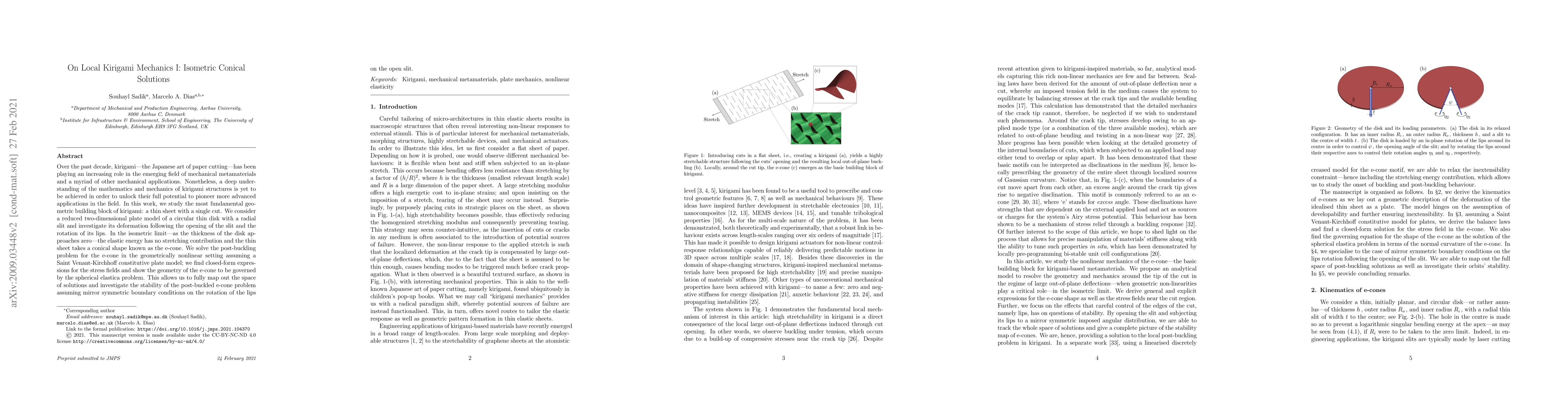 Over the past decade, kirigami--the Japanese art of paper cutting--has been playing an increasing role in the emerging field of mechanical metamaterials and a myriad of other mechanical applications. Nonetheless, a deep understanding of the mathematics and mechanics of kirigami structures is yet to be achieved in order to unlock their full potential to pioneer more advanced applications in the field. In this work, we study the most fundamental geometric building block of kirigami: a thin sheet with a single cut. We consider a reduced two-dimensional plate model of a circular thin disk with a radial slit and investigate its deformation following the opening of the slit and the rotation of its lips. In the isometric limit--as the thickness of the disk approaches zero--the elastic energy has no stretching contribution and the thin sheet takes a conical shape known as the e-cone. We solve the post-buckling problem for the e-cone in the geometrically nonlinear setting assuming a Saint Venant-Kirchhoff constitutive plate model; we find closed-form expressions for the stress fields and show the geometry of the e-cone to be governed by the spherical elastica problem. This allows us to fully map out the space of solutions and investigate the stability of the post-buckled e-cone problem assuming mirror symmetric boundary conditions on the rotation of the lips on the open slit.