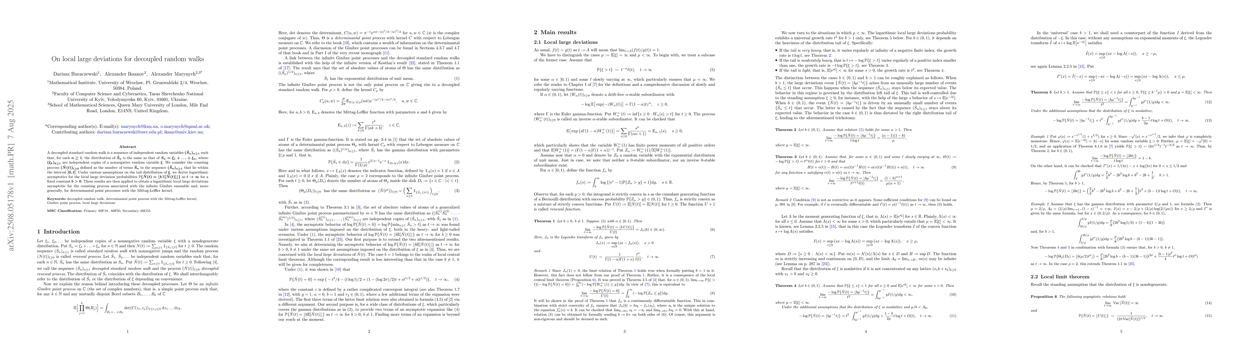 A decoupled standard random walk is a sequence of independent random variables $(\hat{S}_n)_{n \geq 1}$ such that, for each $n \geq 1$, the distribution of $\hat{S}_n$ is the same as that of $S_n = \xi_1 + \ldots + \xi_n$, where $(\xi_k)_{k \geq 1}$ are independent copies of a nonnegative random variable $\xi$. We consider the counting process $(\hat{N}(t))_{t\geq 0}$ defined as the number of terms $\hat{S}_n$ in the sequence $(\hat{S}_n)_{n \geq 1}$ that lie within the interval $[0, t]$. Under various assumptions on the tail distribution of $\xi$, we derive logarithmic asymptotics for the local large deviation probabilities $\mathbb{P}\{\hat{N}(t) = \lfloor b \, \mathbb{E}[\hat{N}(t)] \rfloor\}$ as $t \to \infty$ for a fixed constant $b > 0$. These results are then applied to obtain a logarithmic local large deviations asymptotic for the counting process associated with the infinite Ginibre ensemble and, more generally, for determinantal point processes with the Mittag-Leffler kernel.