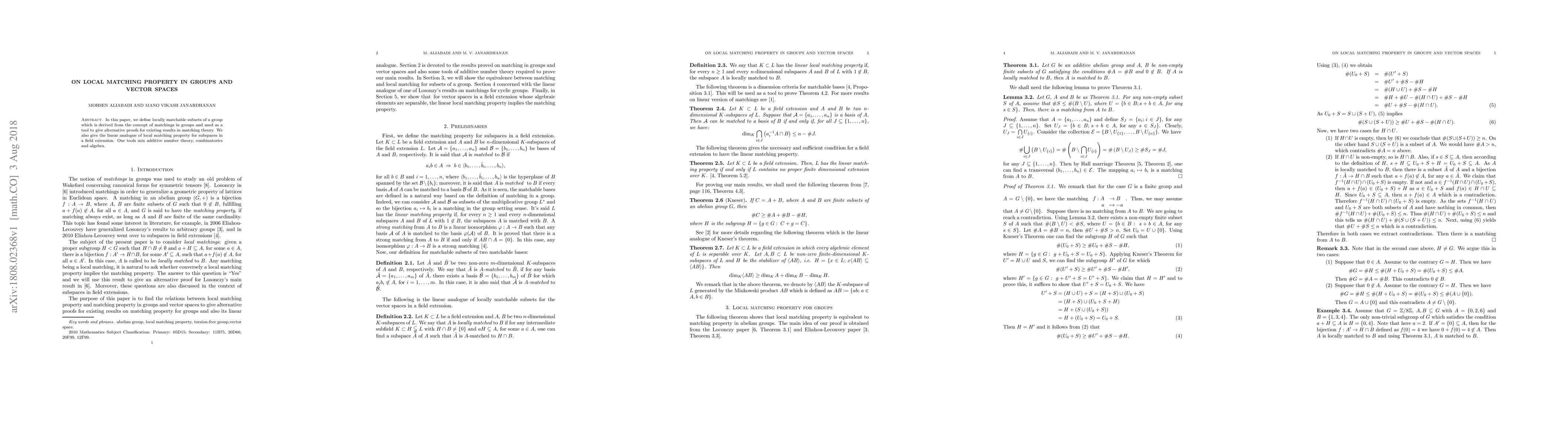 This paper introduces a concept called local matching property in groups and vector spaces, providing an alternative approach to existing results in matching theory, and exploring its implications for additive number theory and combinatorics.