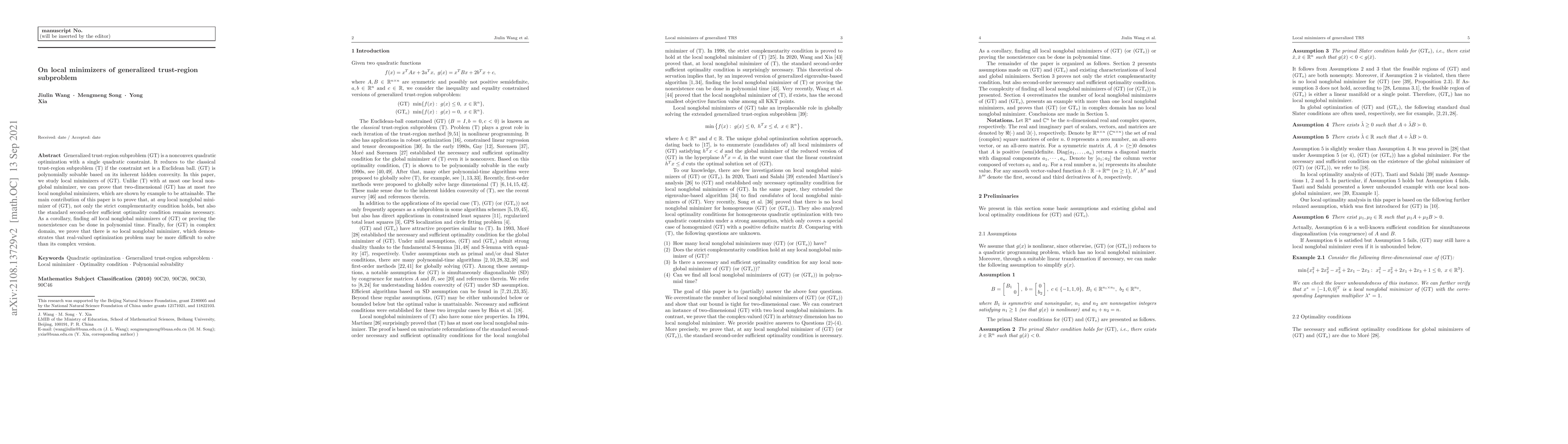 This paper investigates local minimizers of the generalized trust-region subproblem (GT), proving that two-dimensional GT has at most two local nonglobal minimizers. It establishes that at any local nonglobal minimizer, the strict complementarity condition holds, and the second-order sufficient optimality condition remains necessary, allowing polynomial-time determination of all such minimizers.