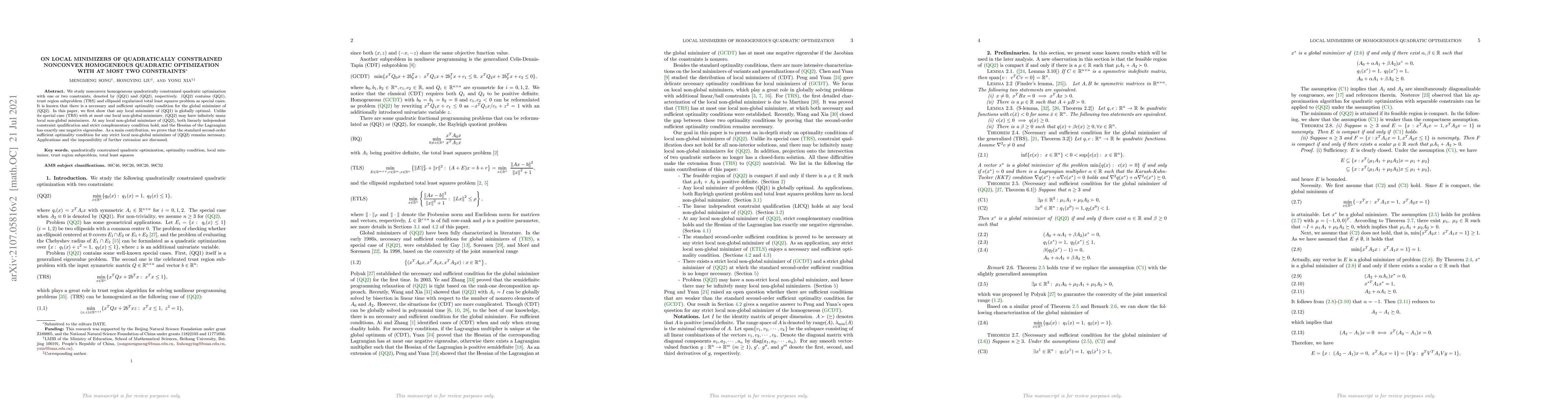 We study nonconvex homogeneous quadratically constrained quadratic optimization with one or two constraints, denoted by (QQ1) and (QQ2), respectively. (QQ2) contains (QQ1), trust region subproblem (TRS) and ellipsoid regularized total least squares problem as special cases. It is known that there is a necessary and sufficient optimality condition for the global minimizer of (QQ2). In this paper, we first show that any local minimizer of (QQ1) is globally optimal. Unlike its special case (TRS) with at most one local non-global minimizer, (QQ2) may have infinitely many local non-global minimizers. At any local non-global minimizer of (QQ2), both linearly independent constraint qualification and strict complementary condition hold, and the Hessian of the Lagrangian has exactly one negative eigenvalue. As a main contribution, we prove that the standard second-order sufficient optimality condition for any strict local non-global minimizer of (QQ2) remains necessary. Applications and the impossibility of further extension are discussed.