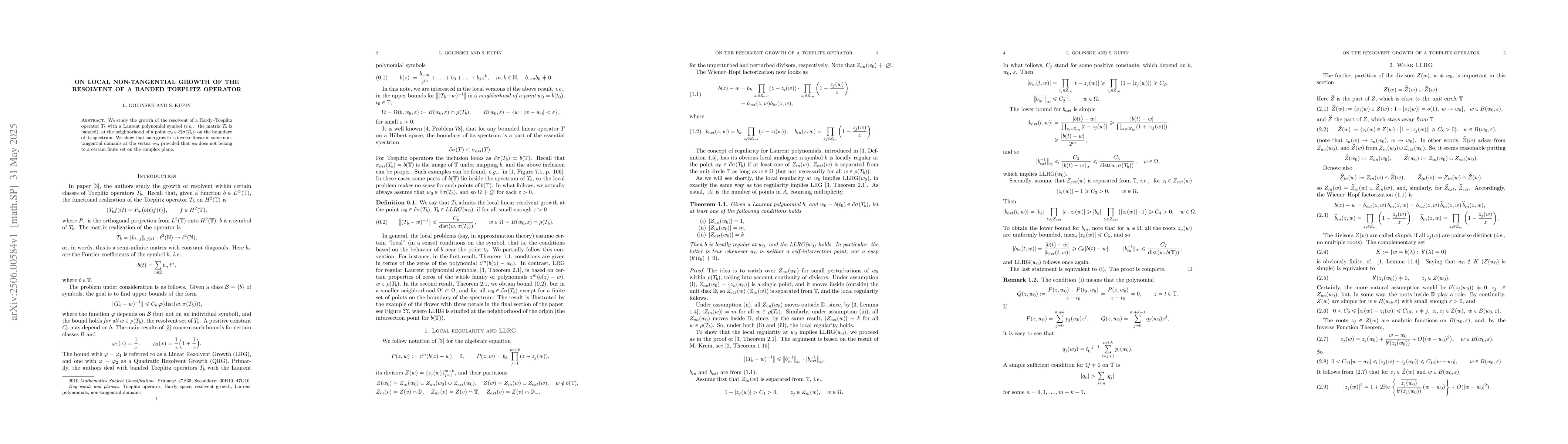 The paper presents a detailed analysis of the local non-tangential growth of the resolvent for banded Toeplitz operators, establishing inverse linearity under specified conditions.