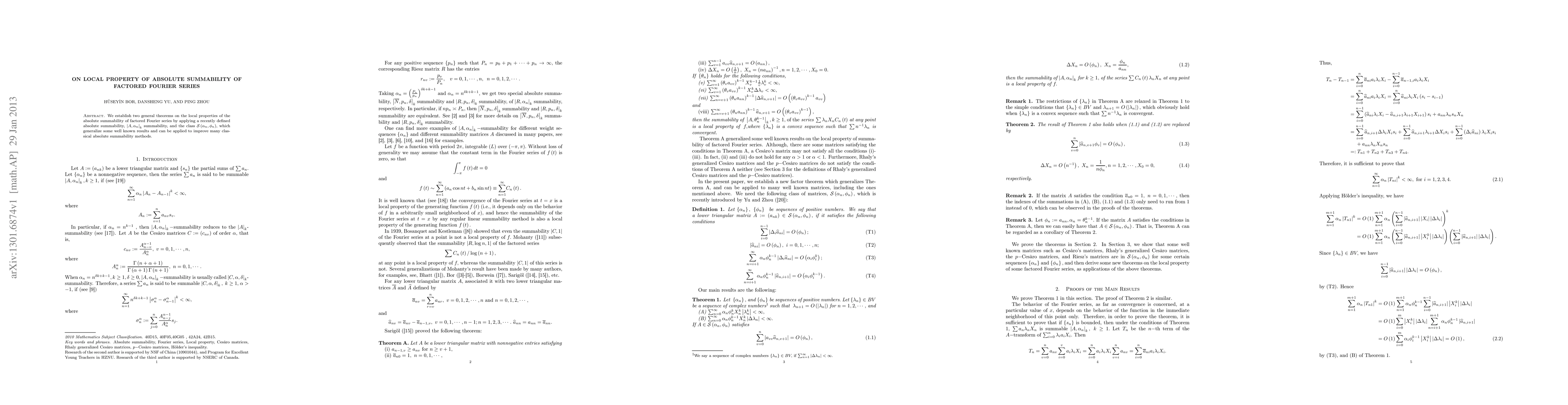 We establish two general theorems on the local properties of the absolute summability of factored Fourier series by applying a recently defined absolute summability, $\left\vert A,\alpha_{n}\right\vert _{k}$ summability, and the class $\mathcal{S}\left( \alpha_{n},\phi_{n}\right) $, which generalize some well known results and can be applied to improve many classical absolute summability methods.