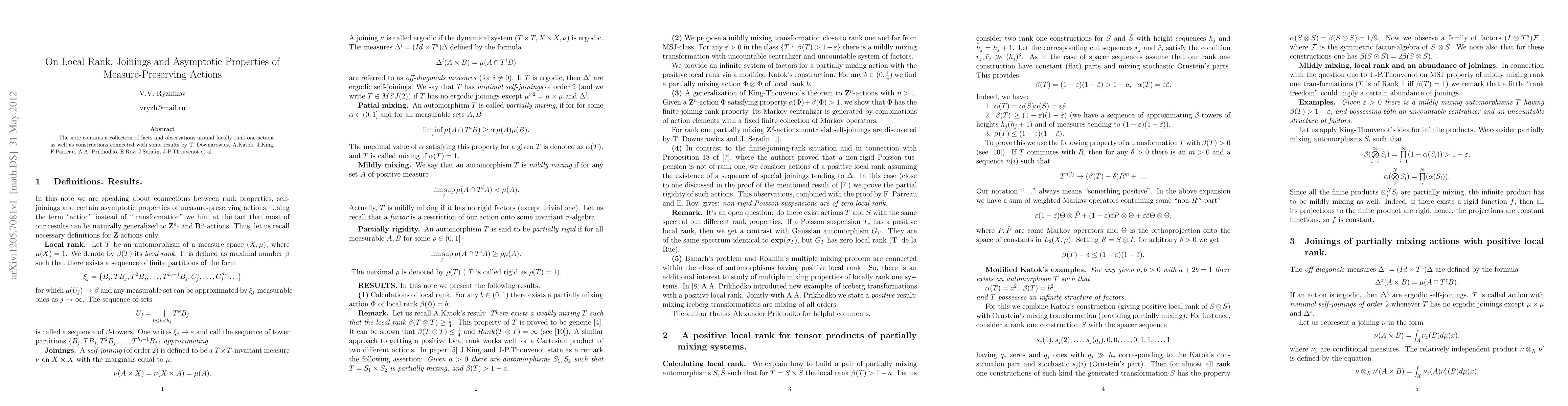 The note contains a collection of facts and observations around locally rank one actions as well as constructions connected with some results by T.Downarowicz, A.Katok, J.King, F.Parreau, A.A.Prikhodko, E.Roy, J.Serafin, J-P.Thouvenot et al.