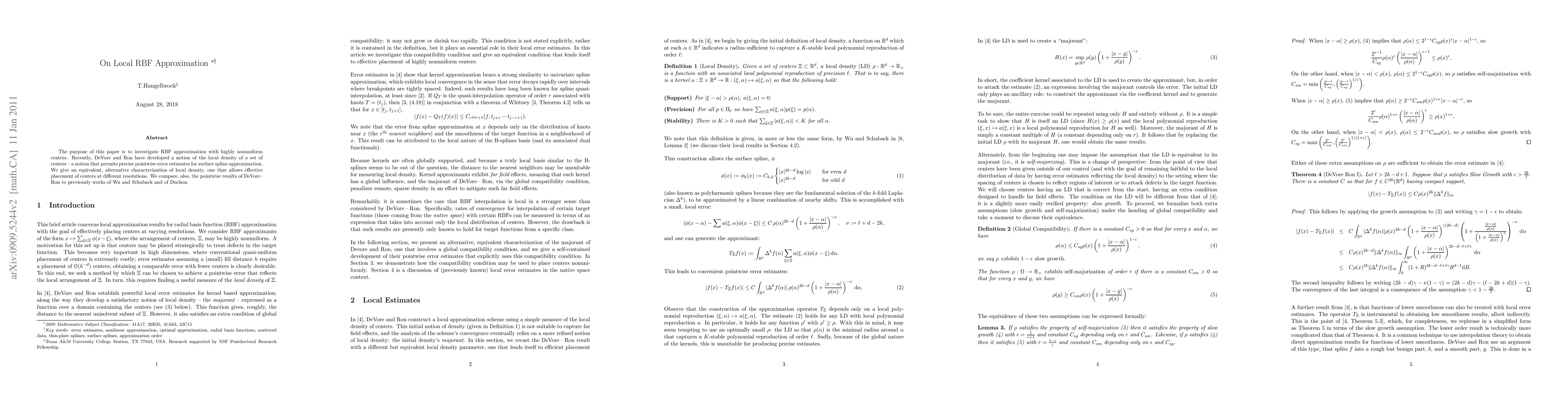This paper investigates RBF approximation with nonuniform centers, developing an alternative characterization of local density for precise pointwise error estimates. It compares results to previous works, allowing effective placement of centers at different resolutions.
