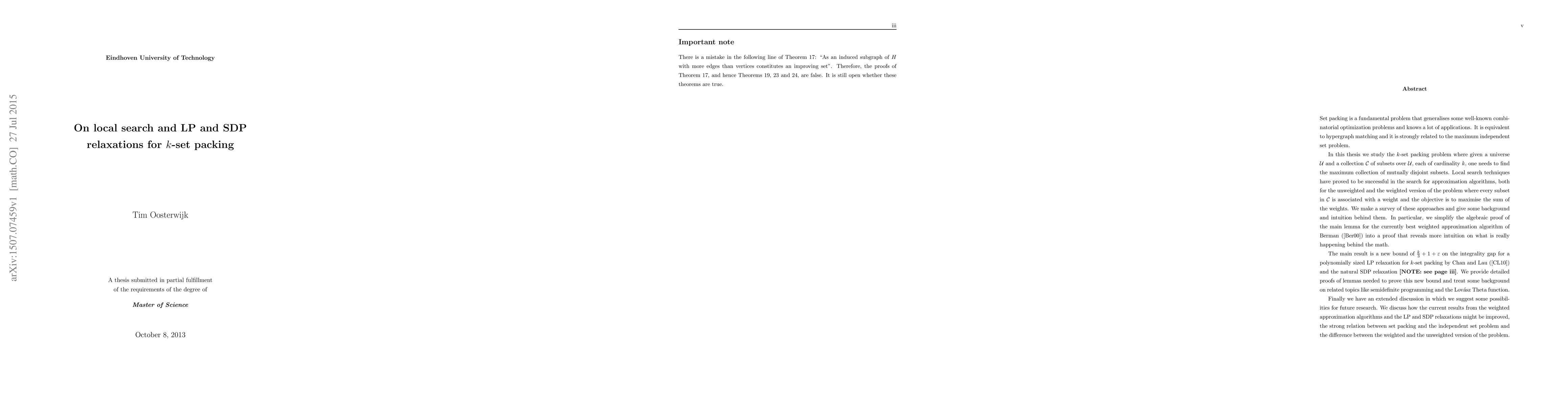 Set packing is a fundamental problem that generalises some well-known combinatorial optimization problems and knows a lot of applications. It is equivalent to hypergraph matching and it is strongly related to the maximum independent set problem. In this thesis we study the k-set packing problem where given a universe U and a collection C of subsets over U, each of cardinality k, one needs to find the maximum collection of mutually disjoint subsets. Local search techniques have proved to be successful in the search for approximation algorithms, both for the unweighted and the weighted version of the problem where every subset in C is associated with a weight and the objective is to maximise the sum of the weights. We make a survey of these approaches and give some background and intuition behind them. In particular, we simplify the algebraic proof of the main lemma for the currently best weighted approximation algorithm of Berman ([Ber00]) into a proof that reveals more intuition on what is really happening behind the math. The main result is a new bound of k/3 + 1 + epsilon on the integrality gap for a polynomially sized LP relaxation for k-set packing by Chan and Lau ([CL10]) and the natural SDP relaxation [NOTE: see page iii]. We provide detailed proofs of lemmas needed to prove this new bound and treat some background on related topics like semidefinite programming and the Lovasz Theta function. Finally we have an extended discussion in which we suggest some possibilities for future research. We discuss how the current results from the weighted approximation algorithms and the LP and SDP relaxations might be improved, the strong relation between set packing and the independent set problem and the difference between the weighted and the unweighted version of the problem.