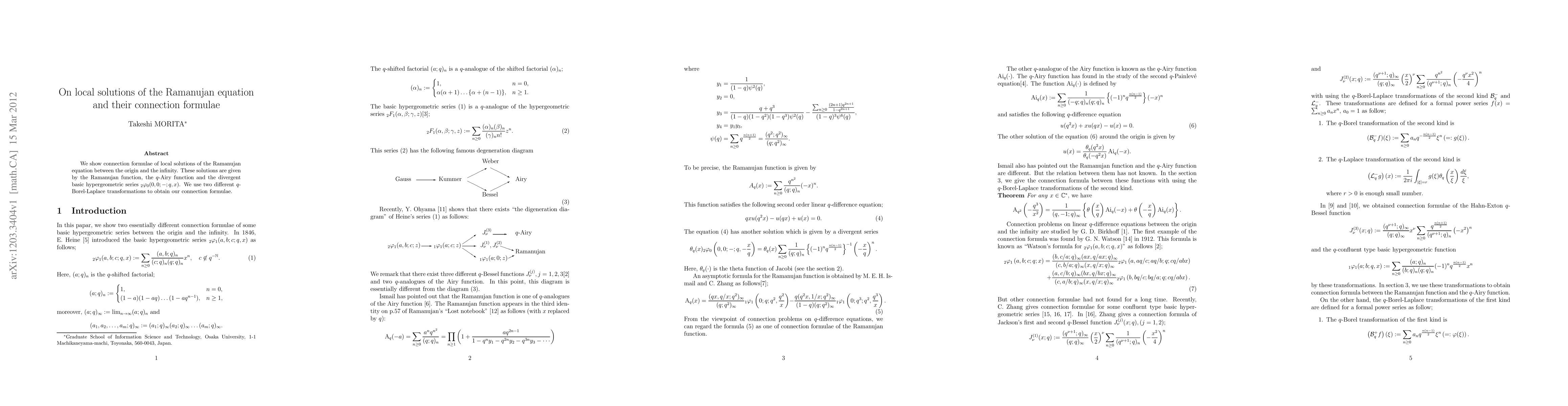 This paper establishes connection formulae for local solutions of the Ramanujan equation between the origin and infinity, utilizing the Ramanujan function, $q$-Airy function, and a divergent basic hypergeometric series. The connection is derived using two distinct $q$-Borel-Laplace transformations.