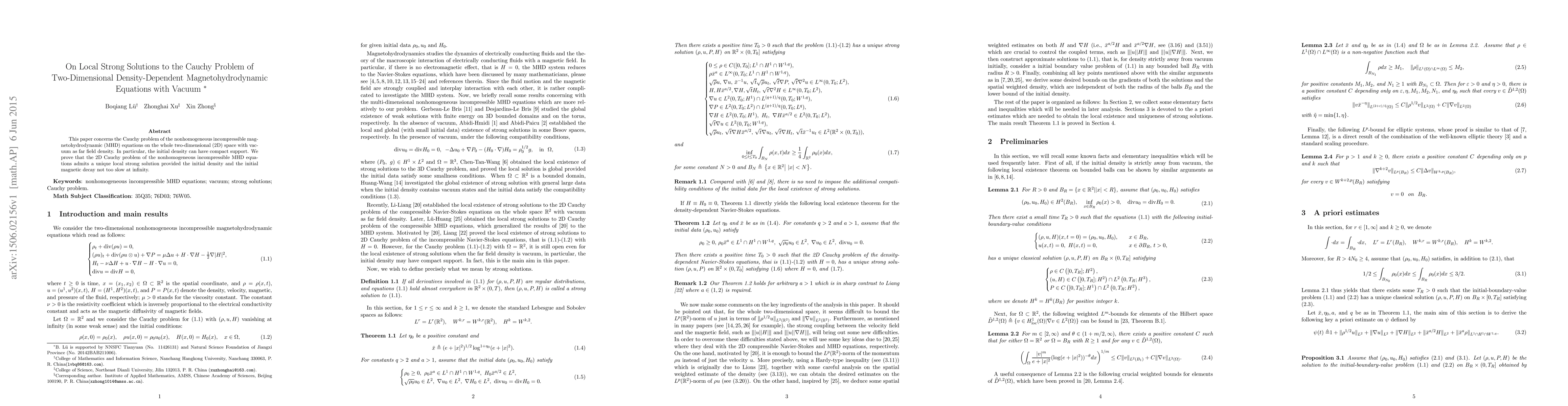 This paper proves the existence of a unique local strong solution to the Cauchy problem for two-dimensional, density-dependent magnetohydrodynamic equations, allowing for vacuum far-field density and initial density with compact support, provided the initial density and magnetic field decay sufficiently fast at infinity.