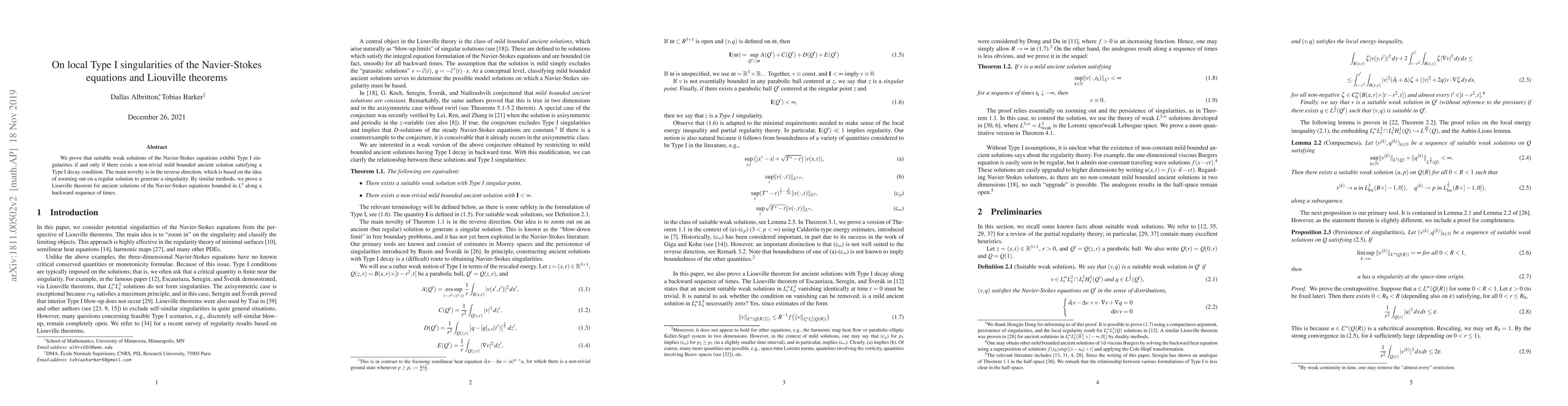 We prove that suitable weak solutions of the Navier-Stokes equations exhibit Type I singularities if and only if there exists a non-trivial mild bounded ancient solution satisfying a Type I decay condition. The main novelty is in the reverse direction, which is based on the idea of zooming out on a regular solution to generate a singularity. By similar methods, we prove a Liouville theorem for ancient solutions of the Navier-Stokes equations bounded in $L^3$ along a backward sequence of times.