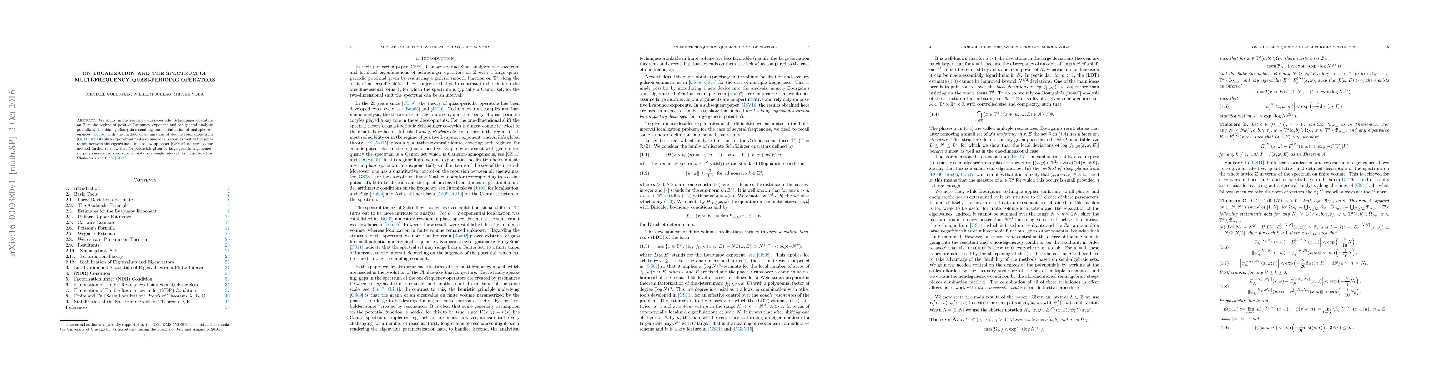 We study multi-frequency quasi-periodic Schr\"odinger operators on $\mathbb{Z}$ in the regime of positive Lyapunov exponent and for general analytic potentials. Combining Bourgain's semi-algebraic elimination of multiple resonances with the method of elimination of double resonances via resultants, we establish exponential finite-volume localization as well as the separation between the eigenvalues. In a follow-up paper we develop the method further to show that for potentials given by large generic trigonometric polynomials the spectrum consists of a single interval, as conjectured by Chulaevski and Sinai.
