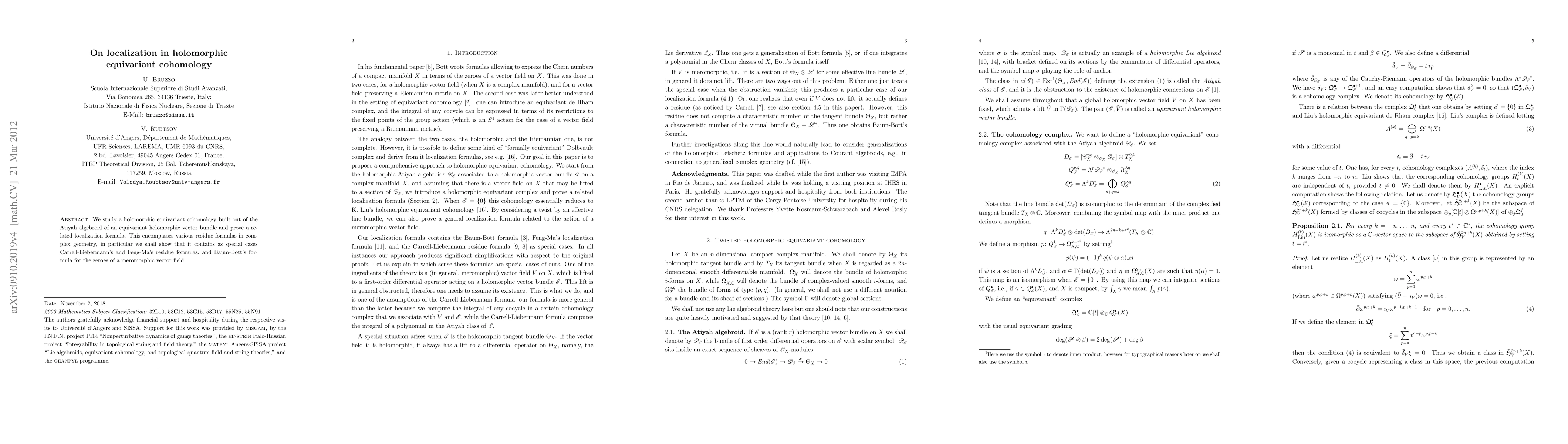 Summary: This paper establishes a localization formula for holomorphic equivariant cohomology linked to the Atiyah algebroid of an equivariant holomorphic vector bundle, extending previous results from Feng-Ma, Carrell-Liebermann, Baum-Bott, and K. Liu.