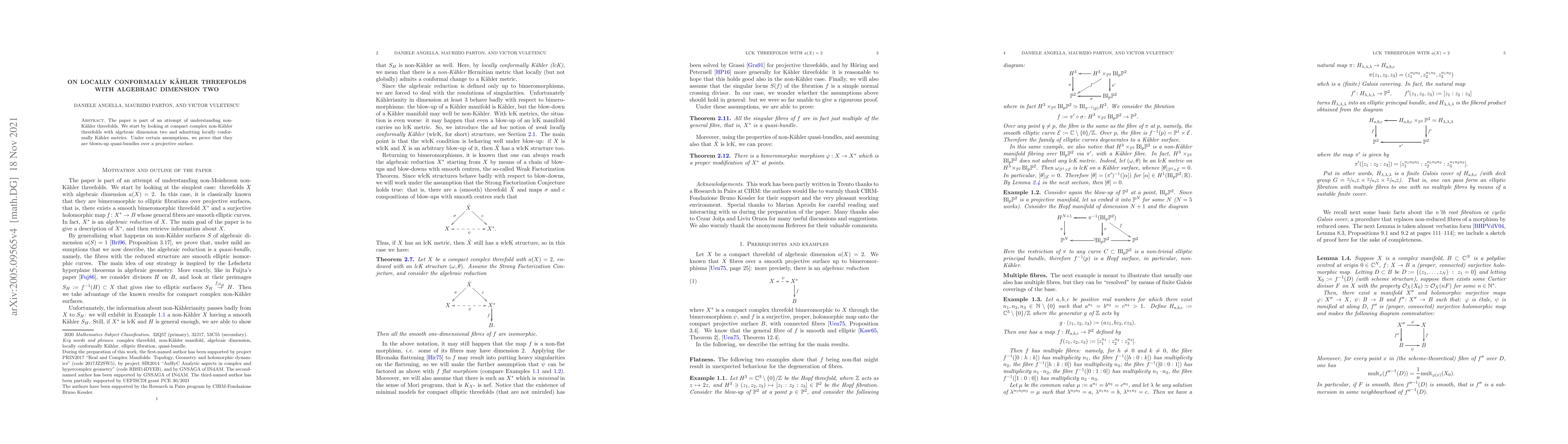This paper investigates compact complex non-Kähler threefolds with algebraic dimension two that admit locally conformally Kähler metrics, proving they are quasi-bundles over a projective surface under certain conditions.