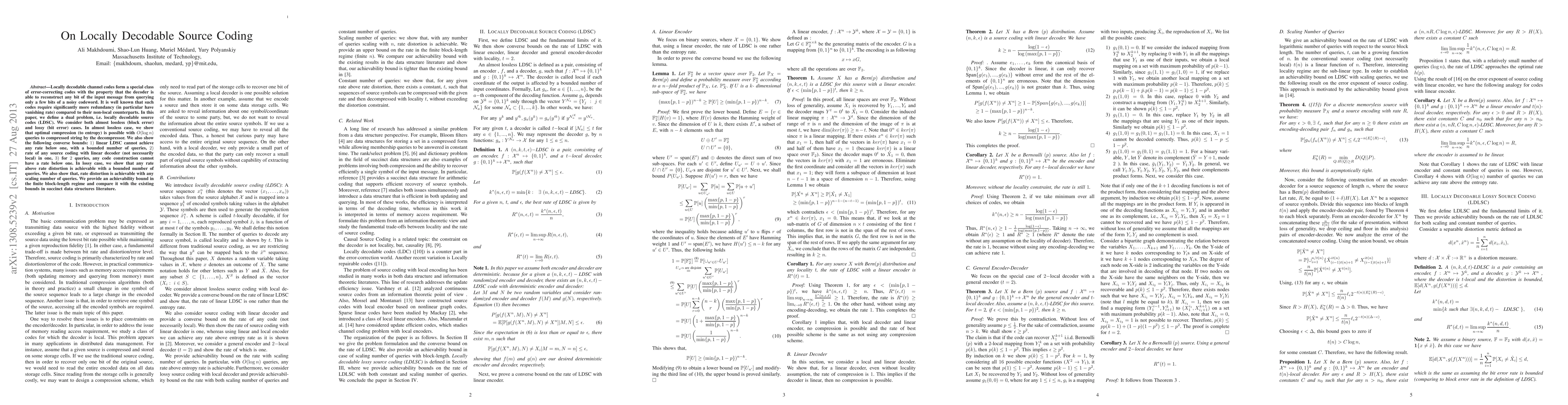Locally decodable channel codes form a special class of error-correcting codes with the property that the decoder is able to reconstruct any bit of the input message from querying only a few bits of a noisy codeword. It is well known that such codes require significantly more redundancy (in particular have vanishing rate) compared to their non-local counterparts. In this paper, we define a dual problem, i.e. locally decodable source codes (LDSC). We consider both almost lossless (block error) and lossy (bit error) cases. In almost lossless case, we show that optimal compression (to entropy) is possible with O(log n) queries to compressed string by the decompressor. We also show the following converse bounds: 1) linear LDSC cannot achieve any rate below one, with a bounded number of queries, 2) rate of any source coding with linear decoder (not necessarily local) in one, 3) for 2 queries, any code construction cannot have a rate below one. In lossy case, we show that any rate above rate distortion is achievable with a bounded number of queries. We also show that, rate distortion is achievable with any scaling number of queries. We provide an achievability bound in the finite block-length regime and compare it with the existing bounds in succinct data structures literature.