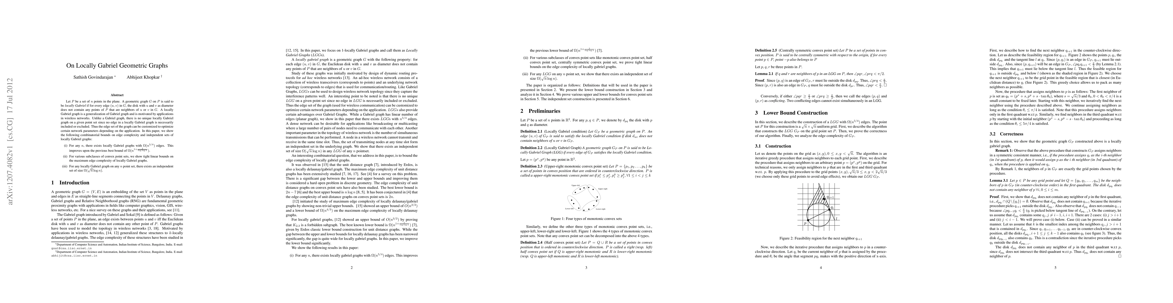 Let $P$ be a set of $n$ points in the plane. A geometric graph $G$ on $P$ is said to be {\it locally Gabriel} if for every edge $(u,v)$ in $G$, the disk with $u$ and $v$ as diameter does not contain any points of $P$ that are neighbors of $u$ or $v$ in $G$. A locally Gabriel graph is a generalization of Gabriel graph and is motivated by applications in wireless networks. Unlike a Gabriel graph, there is no unique locally Gabriel graph on a given point set since no edge in a locally Gabriel graph is necessarily included or excluded. Thus the edge set of the graph can be customized to optimize certain network parameters depending on the application. In this paper, we show the following combinatorial bounds on edge complexity and independent sets of locally Gabriel graphs: (i) For any $n$, there exists locally Gabriel graphs with $\Omega(n^{5/4})$ edges. This improves upon the previous best bound of $\Omega(n^{1+\frac{1}{\log \log n}})$. (ii) For various subclasses of convex point sets, we show tight linear bounds on the maximum edge complexity of locally Gabriel graphs. (iii) For any locally Gabriel graph on any $n$ point set, there exists an independent set of size $\Omega(\sqrt{n}\log n)$.