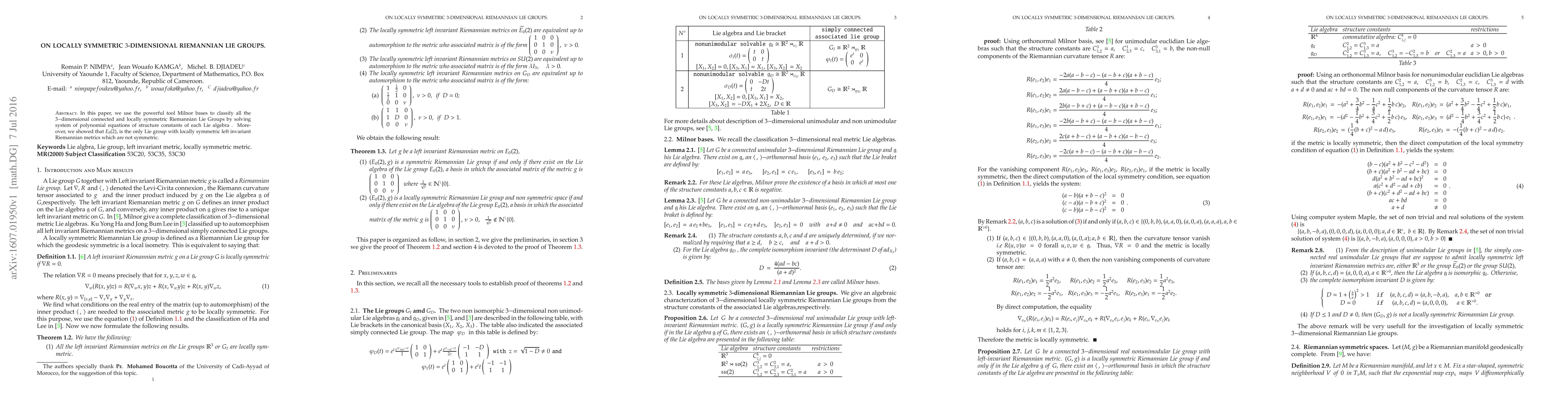 This paper classifies all connected and locally symmetric 3-dimensional Riemannian Lie groups using Milnor bases and polynomial equations, revealing that $E_0(2)$ is the sole group with locally symmetric but non-symmetric left-invariant Riemannian metrics.