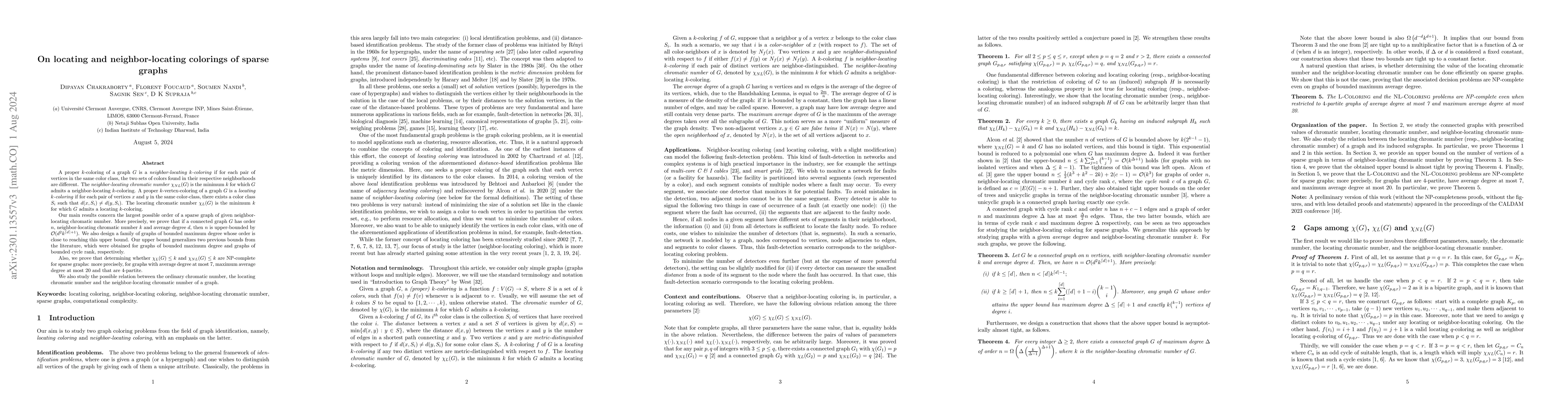 This paper investigates locating and neighbor-locating colorings of sparse graphs, establishing an upper bound on the order of such graphs based on their neighbor-locating chromatic number and average degree. It also proves the NP-completeness of determining these chromatic numbers for specific sparse graph classes.