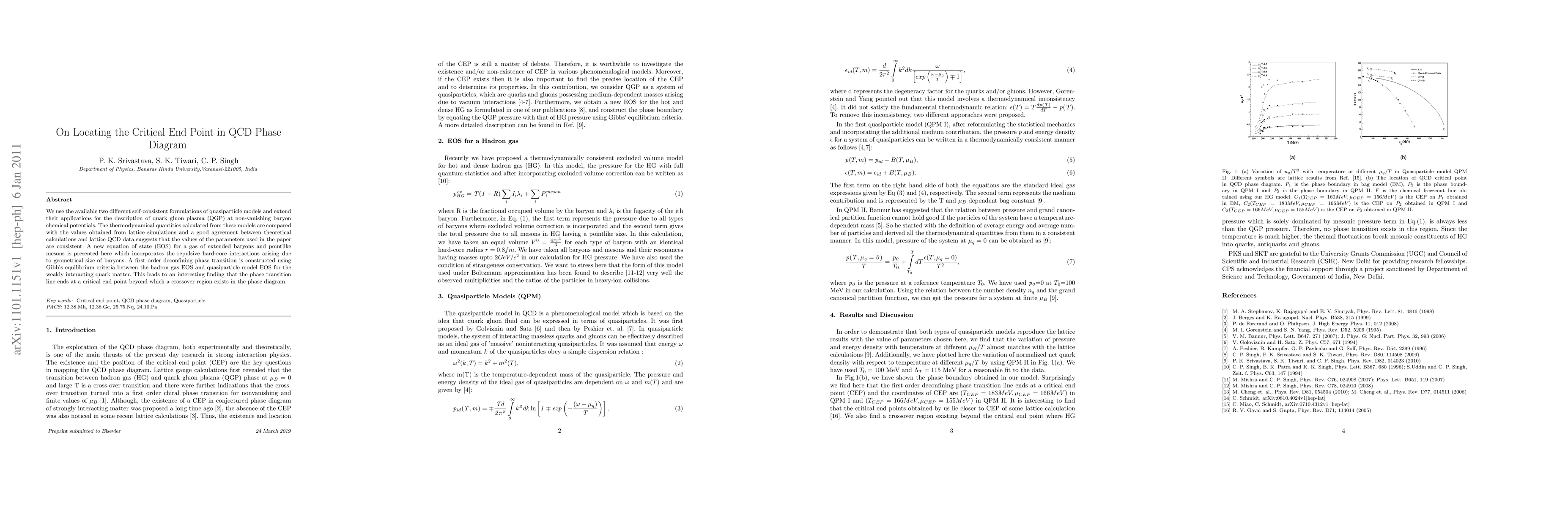 This paper explores the critical end point in the QCD phase diagram using quasiparticle models and compares results with lattice QCD simulations. It introduces a new equation of state incorporating baryon interactions and finds a first-order phase transition ending at a critical endpoint, beyond which a crossover region exists.
