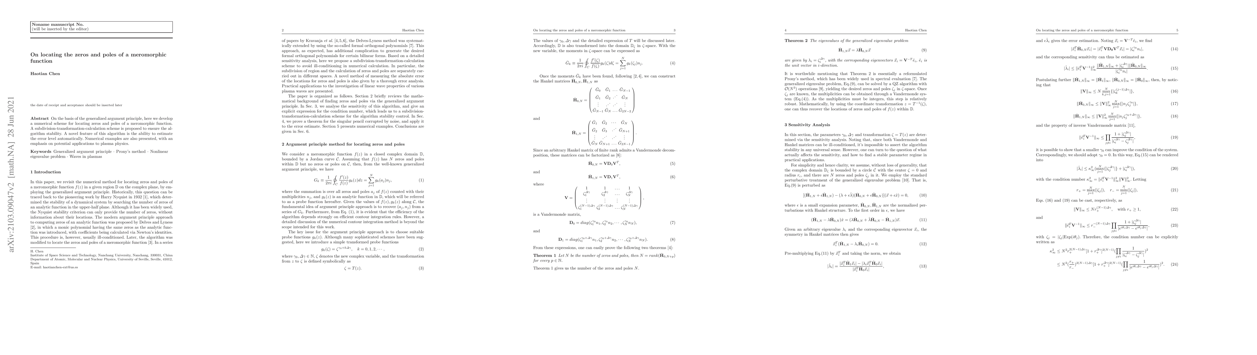 This paper proposes a numerical scheme based on the generalized argument principle to locate zeros and poles of meromorphic functions, employing a subdivision-transformation-calculation method for stability and automatic error estimation. The method is demonstrated with potential applications in plasma physics.