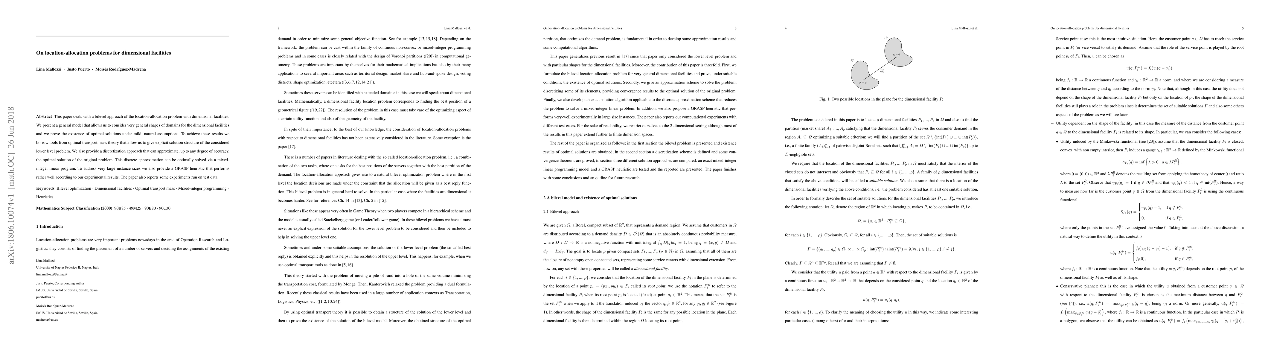This paper deals with a bilevel approach of the location-allocation problem with dimensional facilities. We present a general model that allows us to consider very general shapes of domains for the dimensional facilities and we prove the existence of optimal solutions under mild, natural assumptions. To achieve these results we borrow tools from optimal transport mass theory that allow us to give explicit solution structure of the considered lower level problem. We also provide a discretization approach that can approximate, up to any degree of accuracy, the optimal solution of the original problem. This discrete approximation can be optimally solved via a mixed-integer linear program. To address very large instance sizes we also provide a GRASP heuristic that performs rather well according to our experimental results. The paper also reports some experiments run on test data.