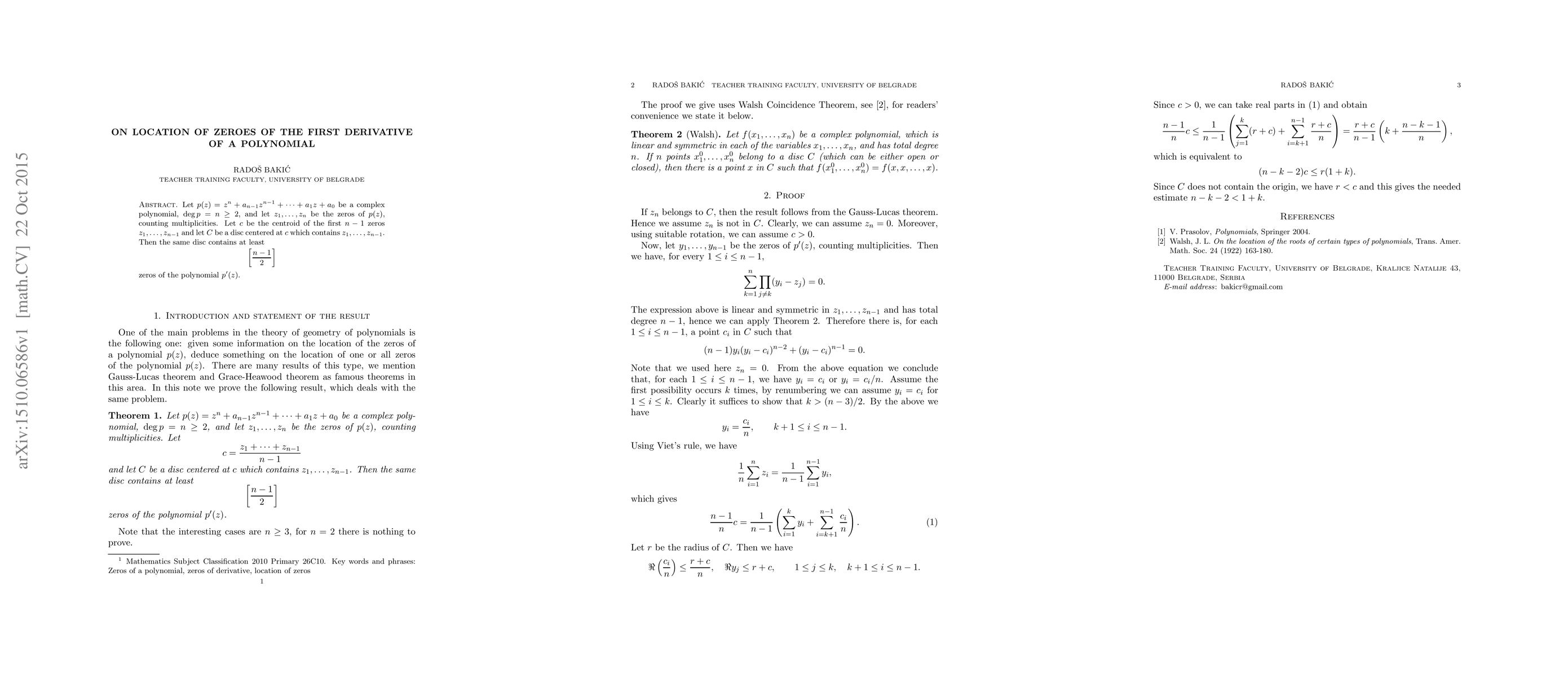 Researchers prove that a circle containing n-1 zeros of a complex polynomial's degree n must also contain at least half of its derivative's zeros.