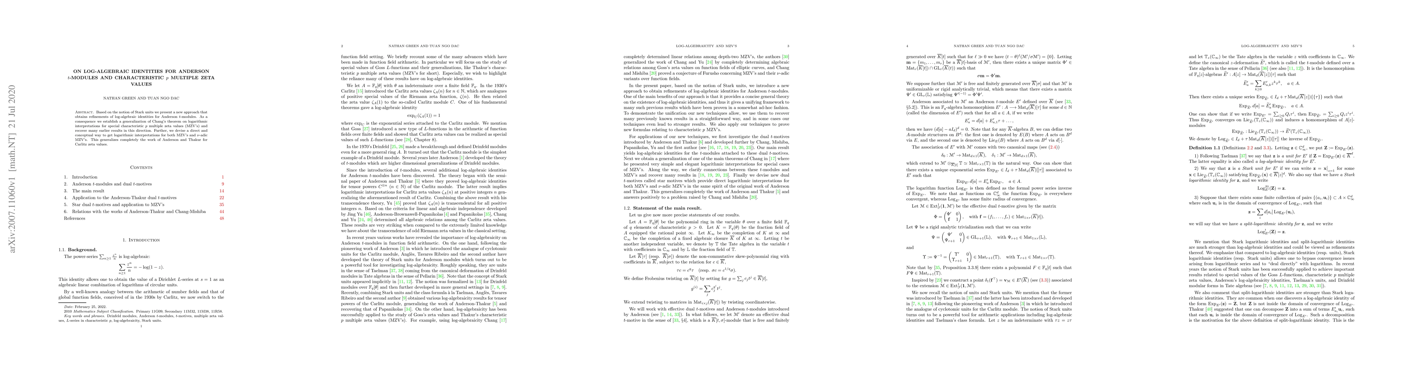 The paper introduces a new method using Stark units to refine log-algebraic identities for Anderson t-modules, leading to a generalization of Chang's theorem on characteristic p multiple zeta values and providing direct interpretations for both MZV's and v-adic MZV's. This extends the work done by Anderson and Thakur on Carlitz zeta values.