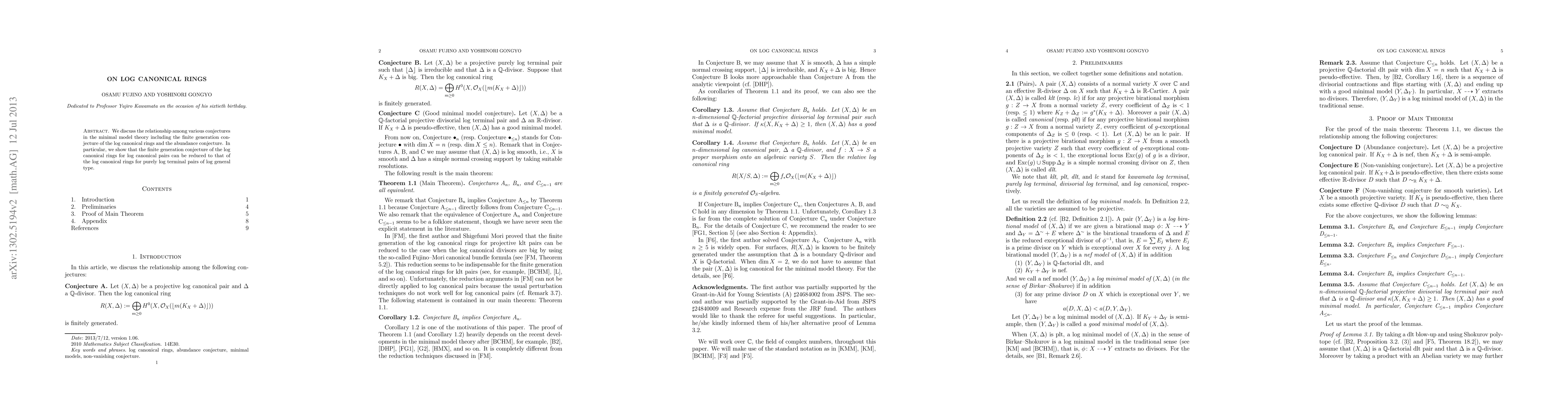 We discuss the relationship among various conjectures in the minimal model theory including the finite generation conjecture of the log canonical rings and the abundance conjecture. In particular, we show that the finite generation conjecture of the log canonical rings for log canonical pairs can be reduced to that of the log canonical rings for purely log terminal pairs of log general type.