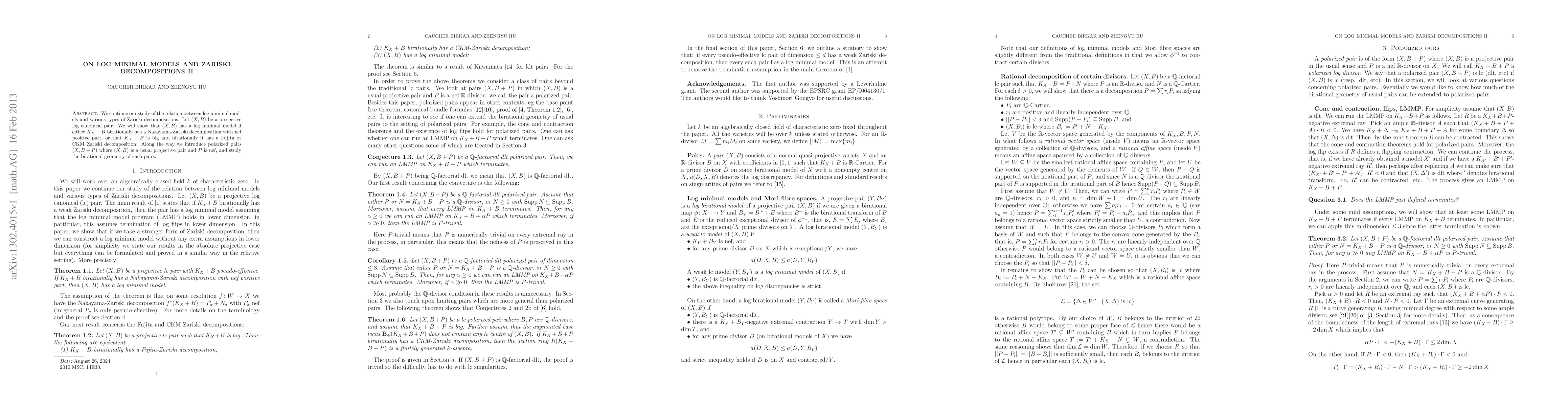 We continue our study of the relation between log minimal models and various types of Zariski decompositions. Let $(X,B)$ be a projective log canonical pair. We will show that $(X,B)$ has a log minimal model if either $K_X+B$ birationally has a Nakayama-Zariski decomposition with nef positive part, or that $K_X+B$ is big and birationally it has a Fujita or CKM Zariski decomposition. Along the way we introduce polarized pairs $(X,B+P)$ where $(X,B)$ is a usual projective pair and $P$ is nef, and study the birational geometry of such pairs.