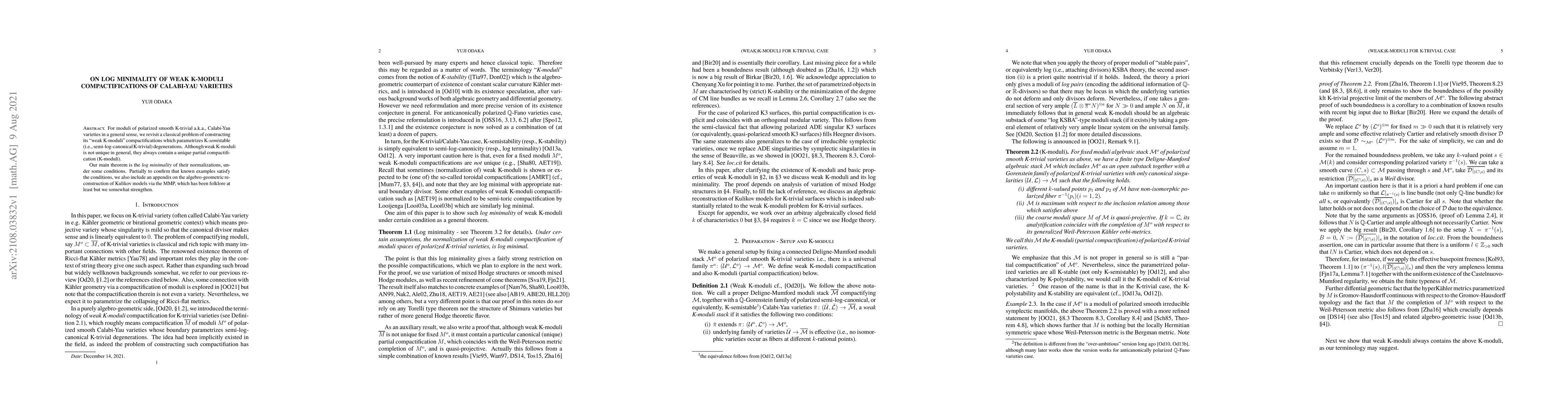 The paper proves the log minimality of normalizations for weak K-moduli compactifications of Calabi-Yau varieties under certain conditions. An appendix provides an algebro-geometric reconstruction of Kulikov models using the Minimal Model Program (MMP).