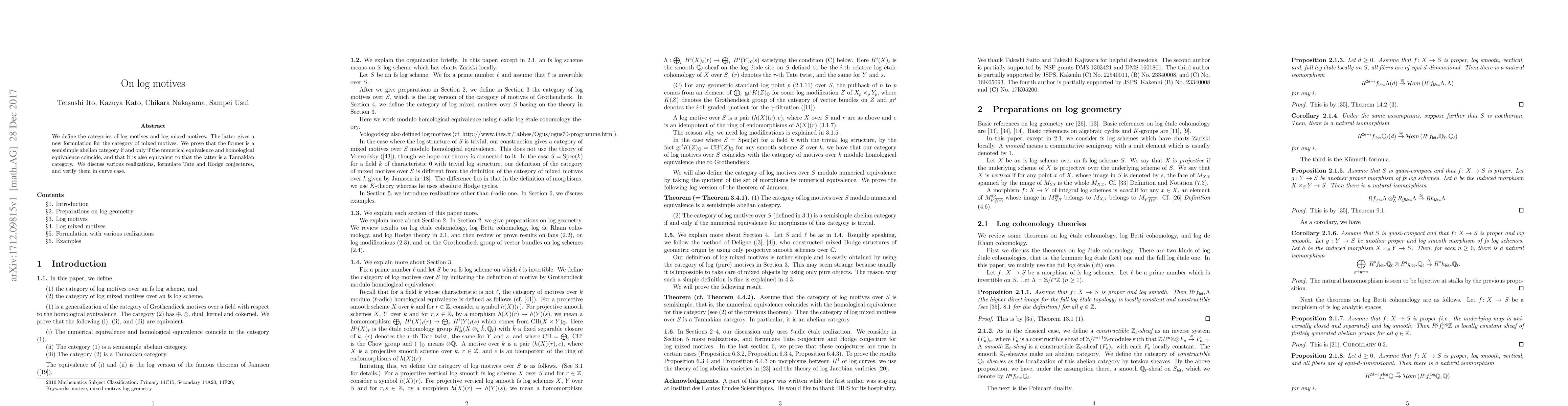 We define the categories of log motives and log mixed motives. The latter gives a new formulation for the category of mixed motives. We prove that the former is a semisimple abelian category if and only if the numerical equivalence and homological equivalence coincide, and that it is also equivalent to that the latter is a Tannakian category. We discuss various realizations, formulate Tate and Hodge conjectures, and verify them in curve case.