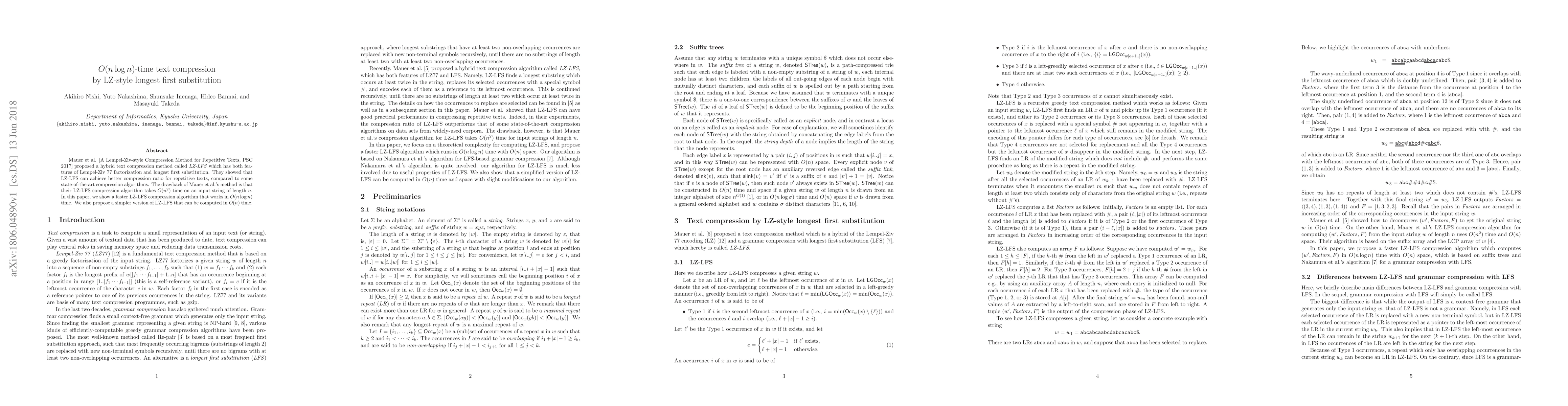 Mauer et al. [A Lempel-Ziv-style Compression Method for Repetitive Texts, PSC 2017] proposed a hybrid text compression method called LZ-LFS which has both features of Lempel-Ziv 77 factorization and longest first substitution. They showed that LZ-LFS can achieve better compression ratio for repetitive texts, compared to some state-of-the-art compression algorithms. The drawback of Mauer et al.'s method is that their LZ-LFS compression algorithm takes $O(n^2)$ time on an input string of length $n$. In this paper, we show a faster LZ-LFS compression algorithm that works in $O(n \log n)$ time. We also propose a simpler version of LZ-LFS that can be computed in $O(n)$ time.