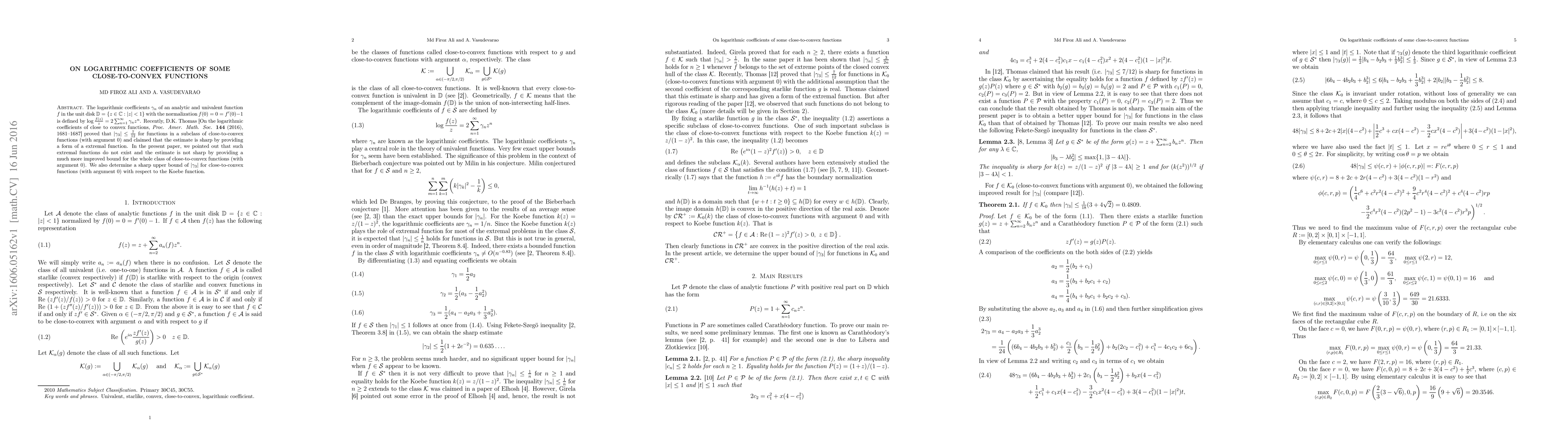 The logarithmic coefficients $\gamma_n$ of an analytic and univalent function $f$ in the unit disk $\mathbb{D}=\{z\in\mathbb{C}:|z|<1\}$ with the normalization $f(0)=0=f'(0)-1$ is defined by $\log \frac{f(z)}{z}= 2\sum_{n=1}^{\infty} \gamma_n z^n$. Recently, D.K. Thomas [On the logarithmic coefficients of close to convex functions, {\it Proc. Amer. Math. Soc.} {\bf 144} (2016), 1681--1687] proved that $|\gamma_3|\le \frac{7}{12}$ for functions in a subclass of close-to-convex functions (with argument $0$) and claimed that the estimate is sharp by providing a form of a extremal function. In the present paper, we pointed out that such extremal functions do not exist and the estimate is not sharp by providing a much more improved bound for the whole class of close-to-convex functions (with argument $0$). We also determine a sharp upper bound of $|\gamma_3|$ for close-to-convex functions (with argument $0$) with respect to the Koebe function.