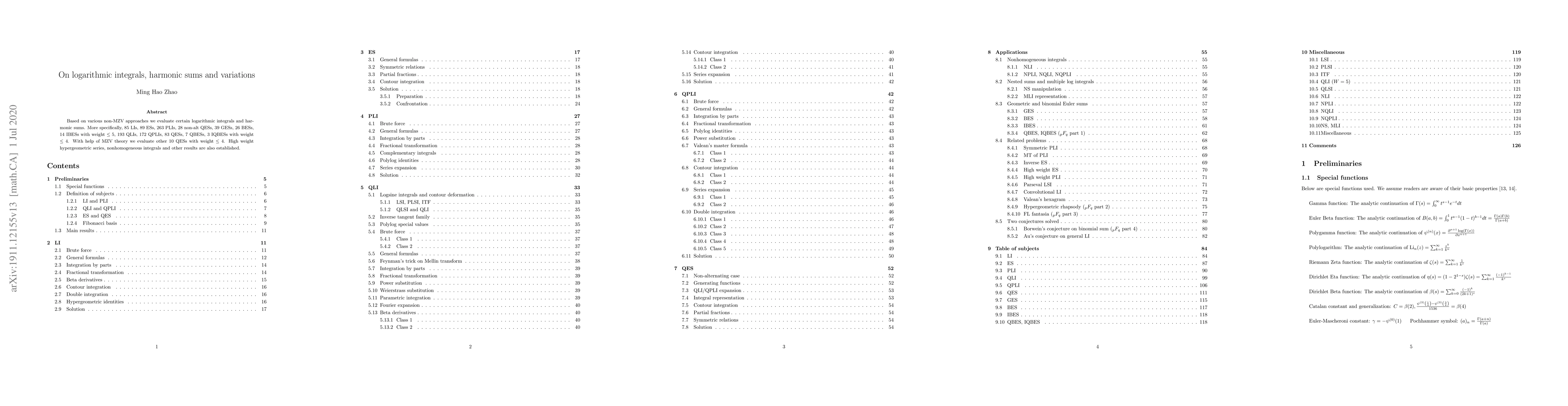 Based on various non-MZV approaches we evaluate certain logarithmic integrals and harmonic sums. More specifically, 85 LIs, 89 ESs, 263 PLIs, 28 non-alt QESs, 39 GESs, 26 BESs,14 IBESs with weight no more than 5, 193 QLIs, 172 QPLIs, 83 QESs, 7 QBESs, 3 IQBESs with weight no more than 4. With help of MZV theory we evaluate other 10 QESs with weight no more than 4. High weight hypergeometric series, nonhomogeneous integrals and other results are also established.