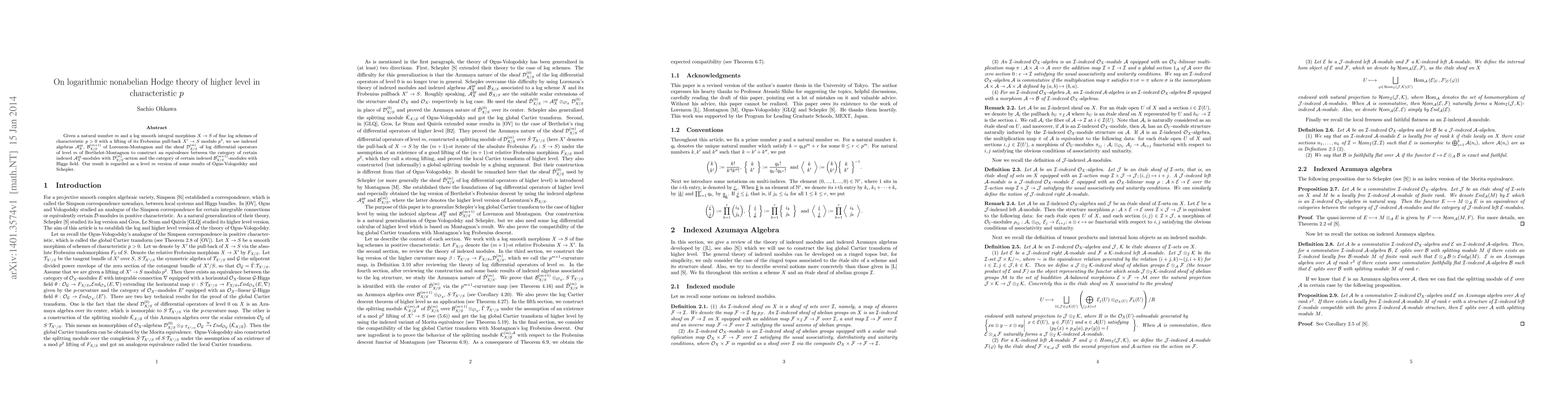 Given a natural number $m$ and a log smooth integral morphism $X\to S$ of fine log schemes of characteristic $p>0$ with a lifting of its Frobenius pull-back $X'\to S$ modulo $p^{2}$, we use indexed algebras ${\cal A}_{X}^{gp}$, ${\cal B}_{X/S}^{(m+1)}$ of Lorenzon-Montagnon and the sheaf ${\cal D}_{X/S}^{(m)}$ of log differential operators of level $m$ of Berthelot-Montagnon to construct an equivalence between the category of certain indexed ${\cal A}_{X}^{gp}$-modules with ${\cal D}_{X/S}^{(m)}$-action and the category of certain indexed ${\cal B}_{X/S}^{(m+1)}$-modules with Higgs field. Our result is regarded as a level $m$ version of some results of Ogus-Vologodsky and Schepler.