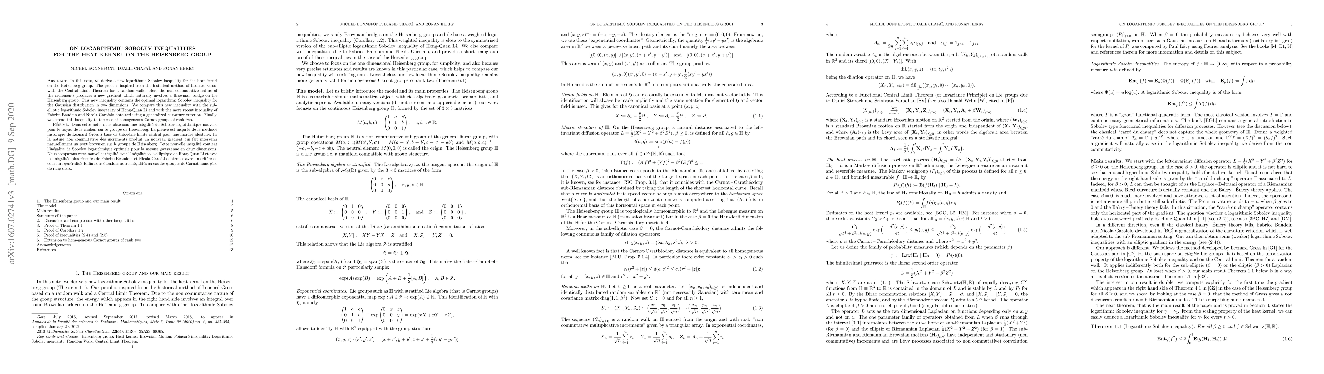 In this note, we derive a new logarithmic Sobolev inequality for the heat kernel on the Heisenberg group. The proof is inspired from the historical method of Leonard Gross with the Central Limit Theorem for a random walk. Here the non commutative nature of the increments produces a new gradient which naturally involves a Brownian bridge on the Heisenberg group. This new inequality contains the optimal logarithmic Sobolev inequality for the Gaussian distribution in two dimensions. We compare this new inequality with the sub-elliptic logarithmic Sobolev inequality of Hong-Quan Li and with the more recent inequality of Fabrice Baudoin and Nicola Garofalo obtained using a generalized curvature criterion. Finally, we extend this inequality to the case of homogeneous Carnot groups of rank two.