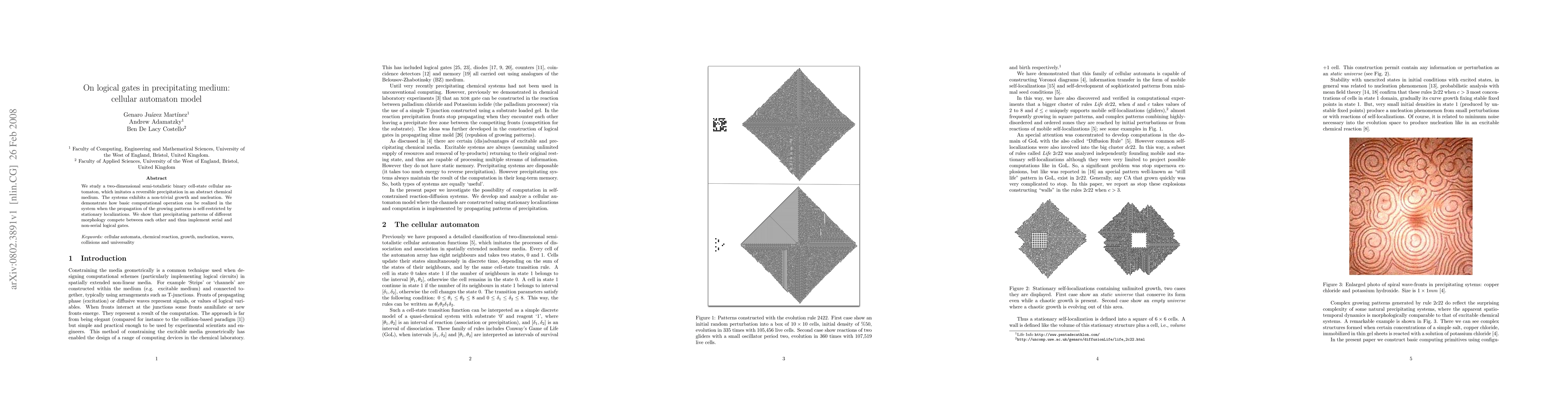 This research explores a 2D cellular automaton mimicking reversible precipitation in a chemical medium, demonstrating that self-restricted growing patterns can realize computational operations. The study reveals competition between patterns of different morphologies implementing serial and non-serial logical gates.