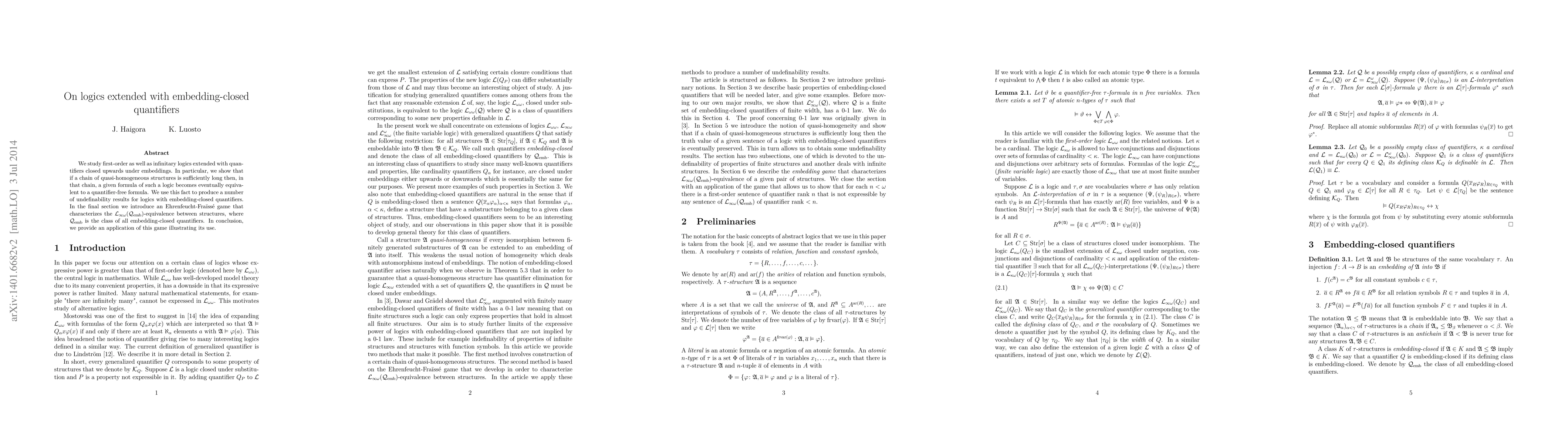 This paper explores logics augmented with embedding-closed quantifiers, proving that long chains of quasi-homogeneous structures eventually render formulas equivalent to quantifier-free ones. It also introduces an Ehrenfeucht-Fraissé game to characterize $L$-equivalence in extended infinitary logics and demonstrates its application.