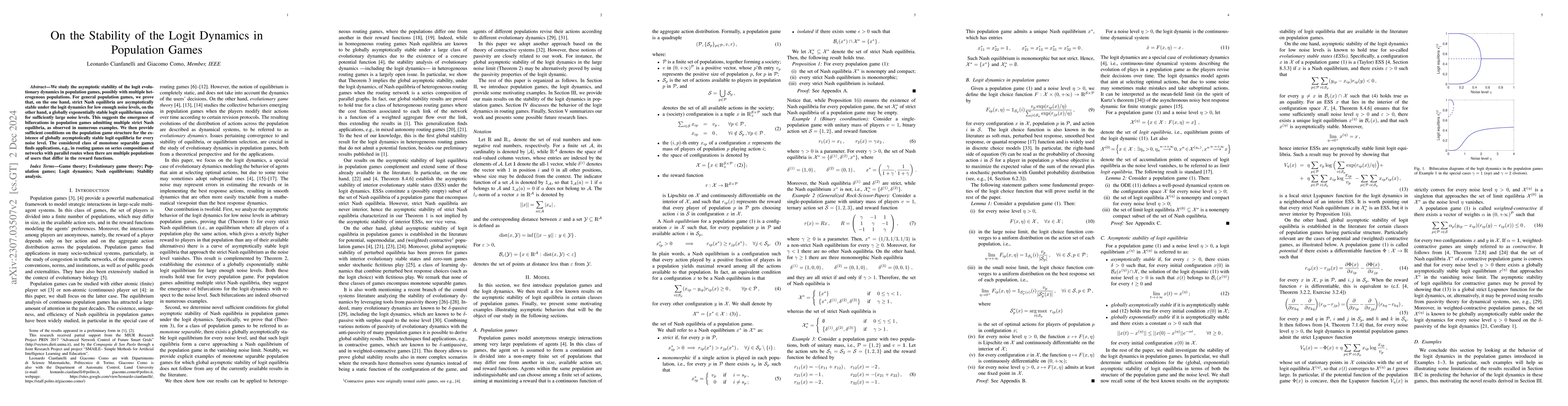 The paper studies the logit evolutionary dynamics in population games, proving local asymptotic stability of strict Nash equilibria in the low noise regime and global exponential stability in the high noise regime.