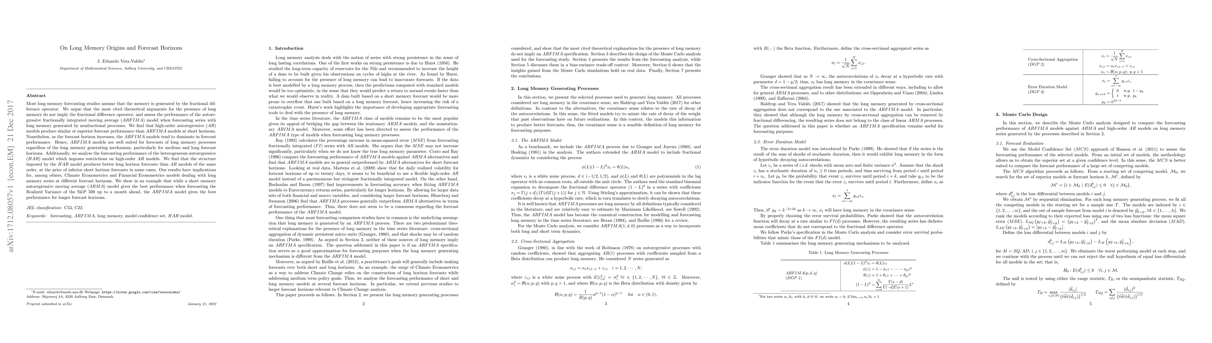 A study compares ARFIMA models to high-order autoregressive (AR) models for forecasting long memory processes, finding that ARFIMA performs better at medium to long horizons but not short ones.