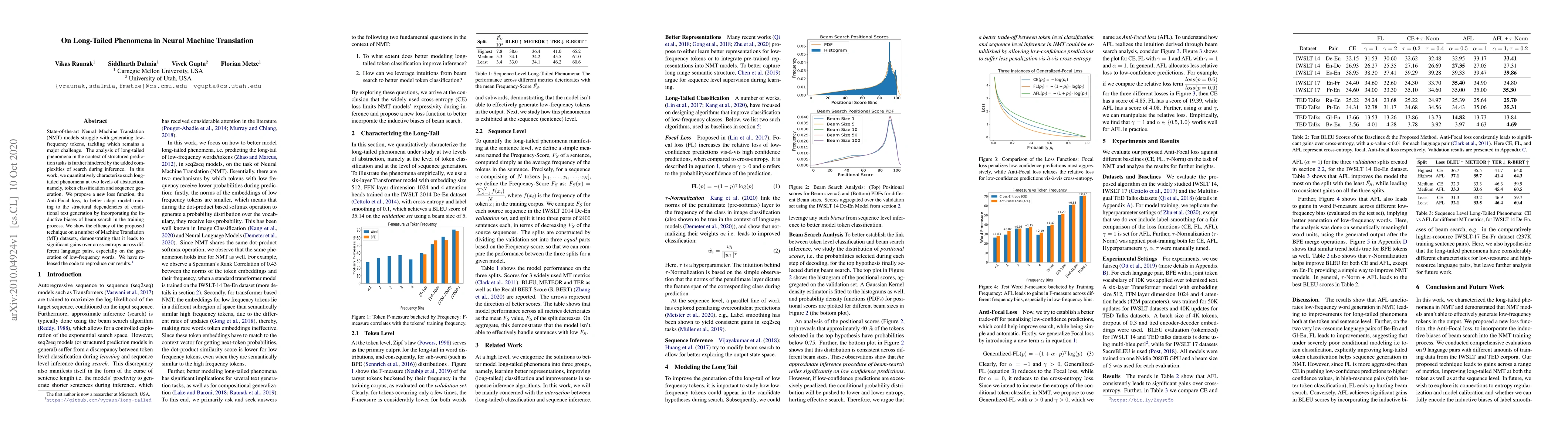 State-of-the-art Neural Machine Translation (NMT) models struggle with generating low-frequency tokens, tackling which remains a major challenge. The analysis of long-tailed phenomena in the context of structured prediction tasks is further hindered by the added complexities of search during inference. In this work, we quantitatively characterize such long-tailed phenomena at two levels of abstraction, namely, token classification and sequence generation. We propose a new loss function, the Anti-Focal loss, to better adapt model training to the structural dependencies of conditional text generation by incorporating the inductive biases of beam search in the training process. We show the efficacy of the proposed technique on a number of Machine Translation (MT) datasets, demonstrating that it leads to significant gains over cross-entropy across different language pairs, especially on the generation of low-frequency words. We have released the code to reproduce our results.