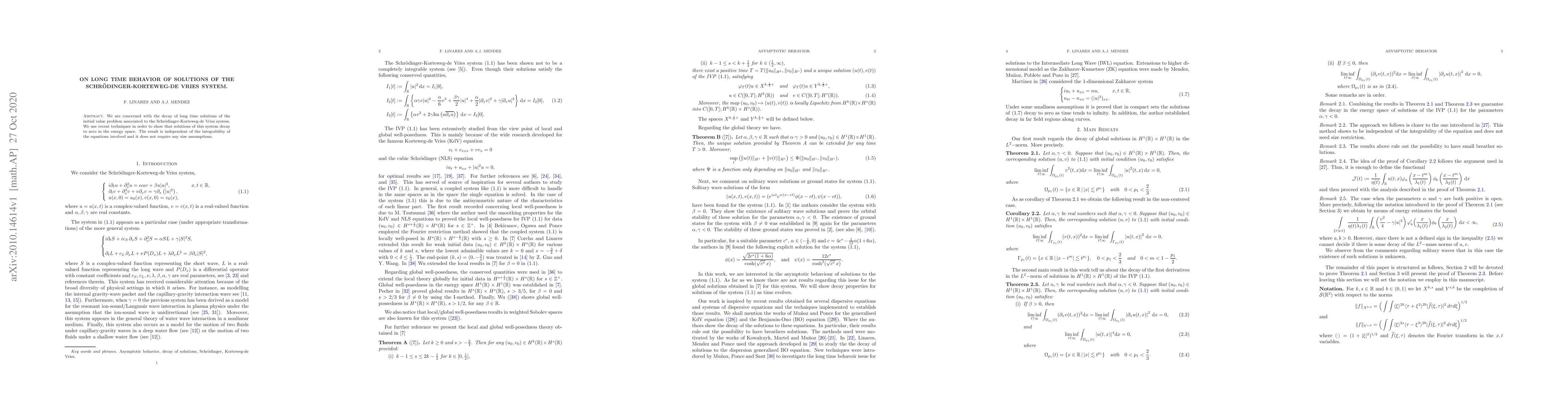 This paper investigates the long-time behavior of solutions to the Schrödinger-Korteweg-de Vries system, demonstrating that solutions decay to zero in the energy space using recent techniques. The result holds independently of the system's integrability and without size assumptions.