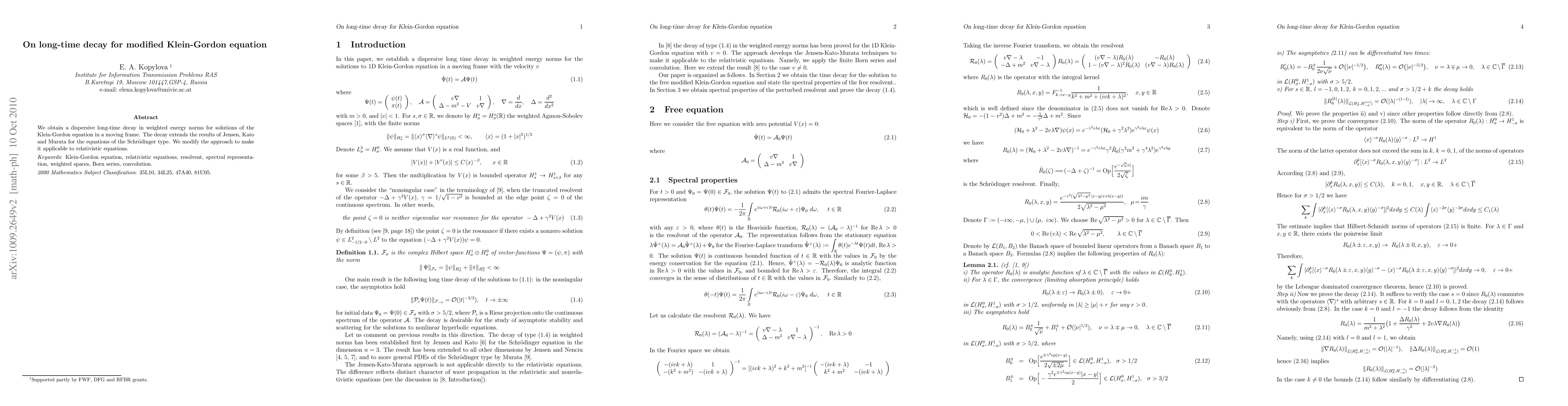 Summary: This paper establishes dispersive long-time decay for solutions of the modified Klein-Gordon equation in a moving frame, extending previous results for Schrödinger-type equations and adapting the methodology for relativistic contexts.