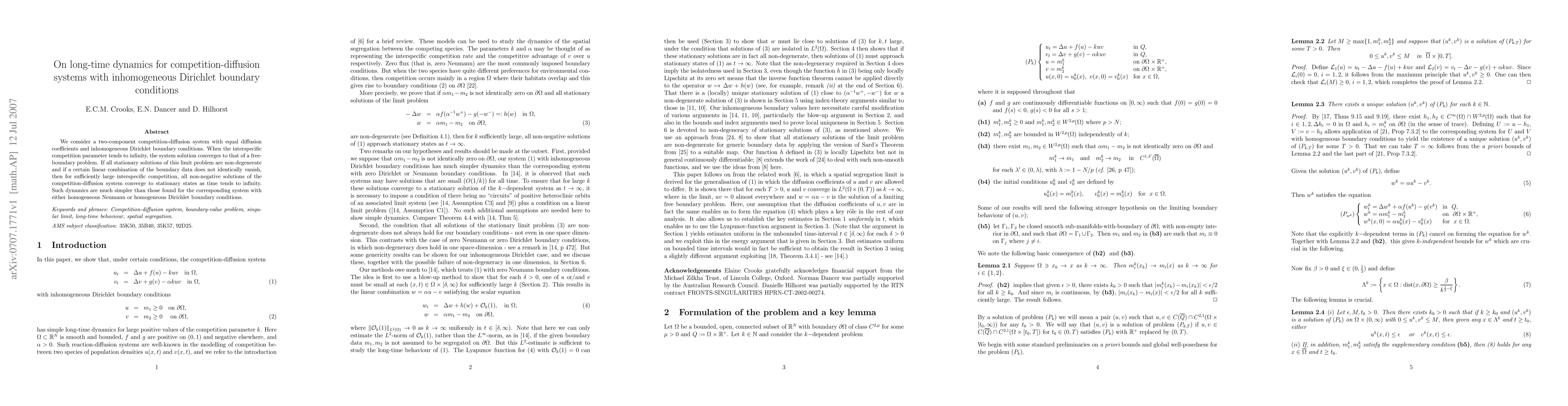 A competition-diffusion system with inhomogeneous Dirichlet boundary conditions converges to stationary states for sufficiently large interspecific competition, leading to simpler dynamics compared to other boundary conditions.