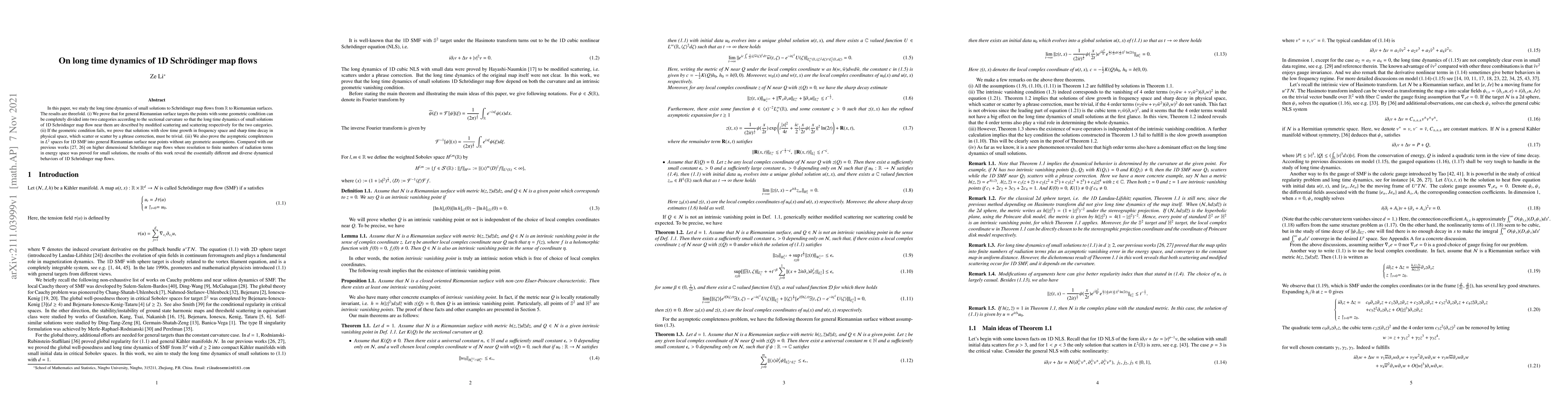 This paper investigates the long-term dynamics of small solutions to 1D Schrödinger map flows from $\Bbb R$ to Riemannian surfaces, revealing distinct behaviors based on sectional curvature and proving asymptotic completeness in $L^2$ spaces for general targets.