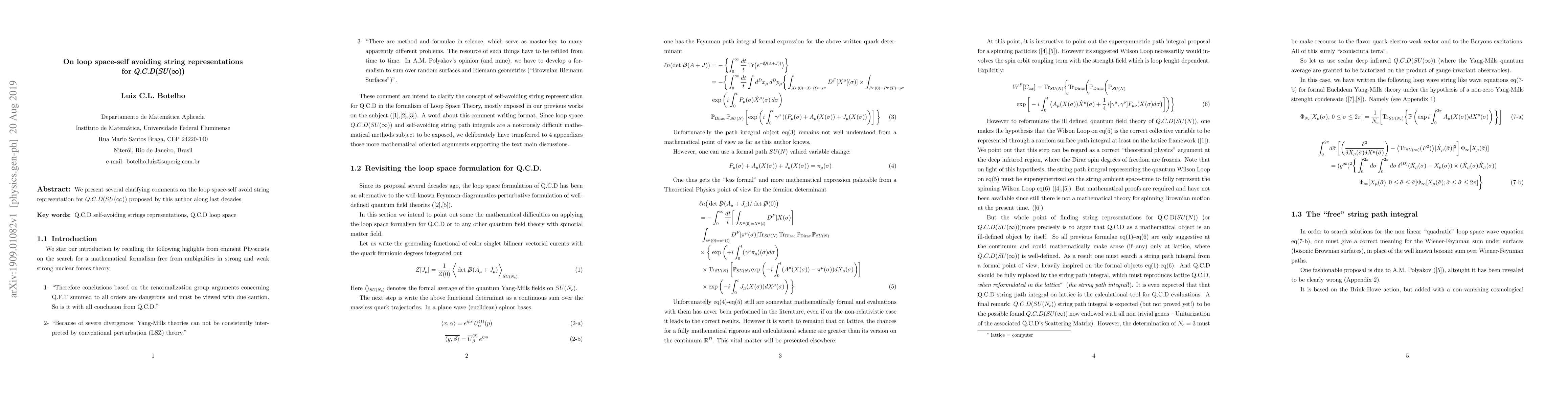 Summary: This paper provides clarifications and insights on loop space self-avoiding string representations for Quantum Chromodynamics (QCD) in the context of SU(infinity), building on the author's previous decade-long work in this area. It aims to refine and enhance the understanding of these theoretical frameworks.