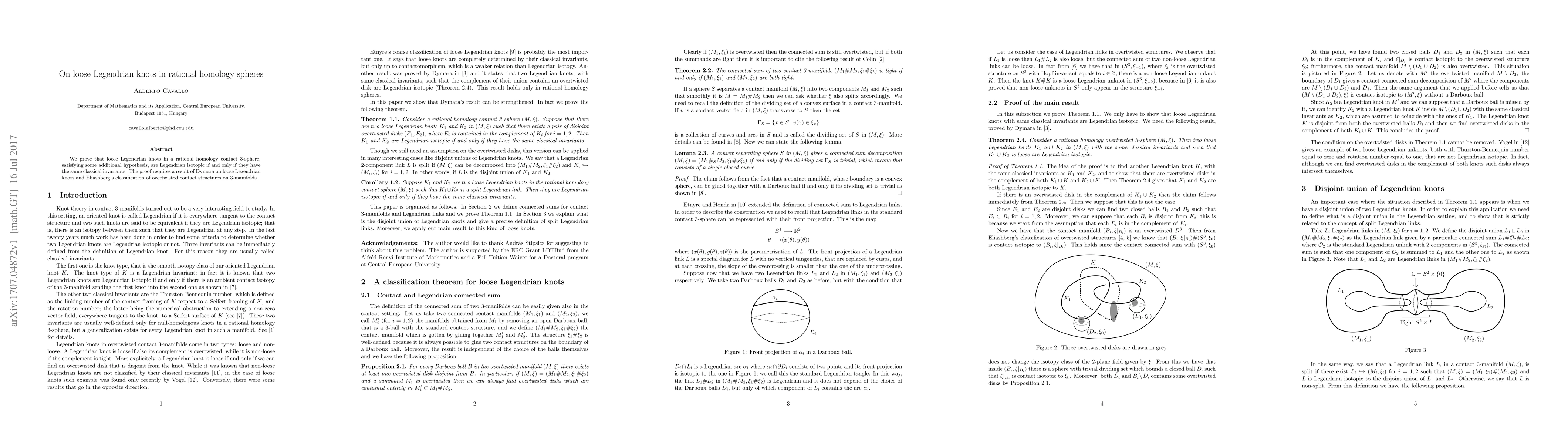 Summary: The paper proves that loose Legendrian knots in rational homology contact 3-spheres are Legendrian isotopic if and only if they share the same classical invariants, leveraging Dymara's result and Eliashberg's classification of overtwisted contact structures.