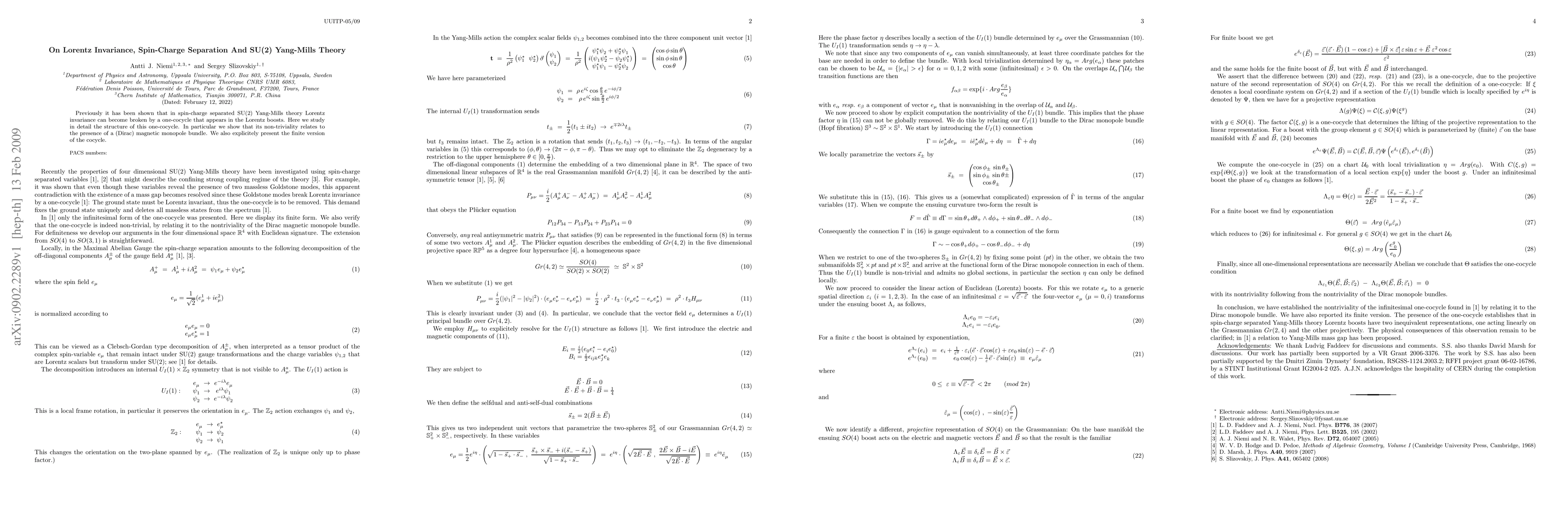 Previously it has been shown that in spin-charge separated SU(2) Yang-Mills theory Lorentz invariance can become broken by a one-cocycle that appears in the Lorentz boosts. Here we study in detail the structure of this one-cocycle. In particular we show that its non-triviality relates to the presence of a (Dirac) magnetic monopole bundle. We also explicitely present the finite version of the cocycle.